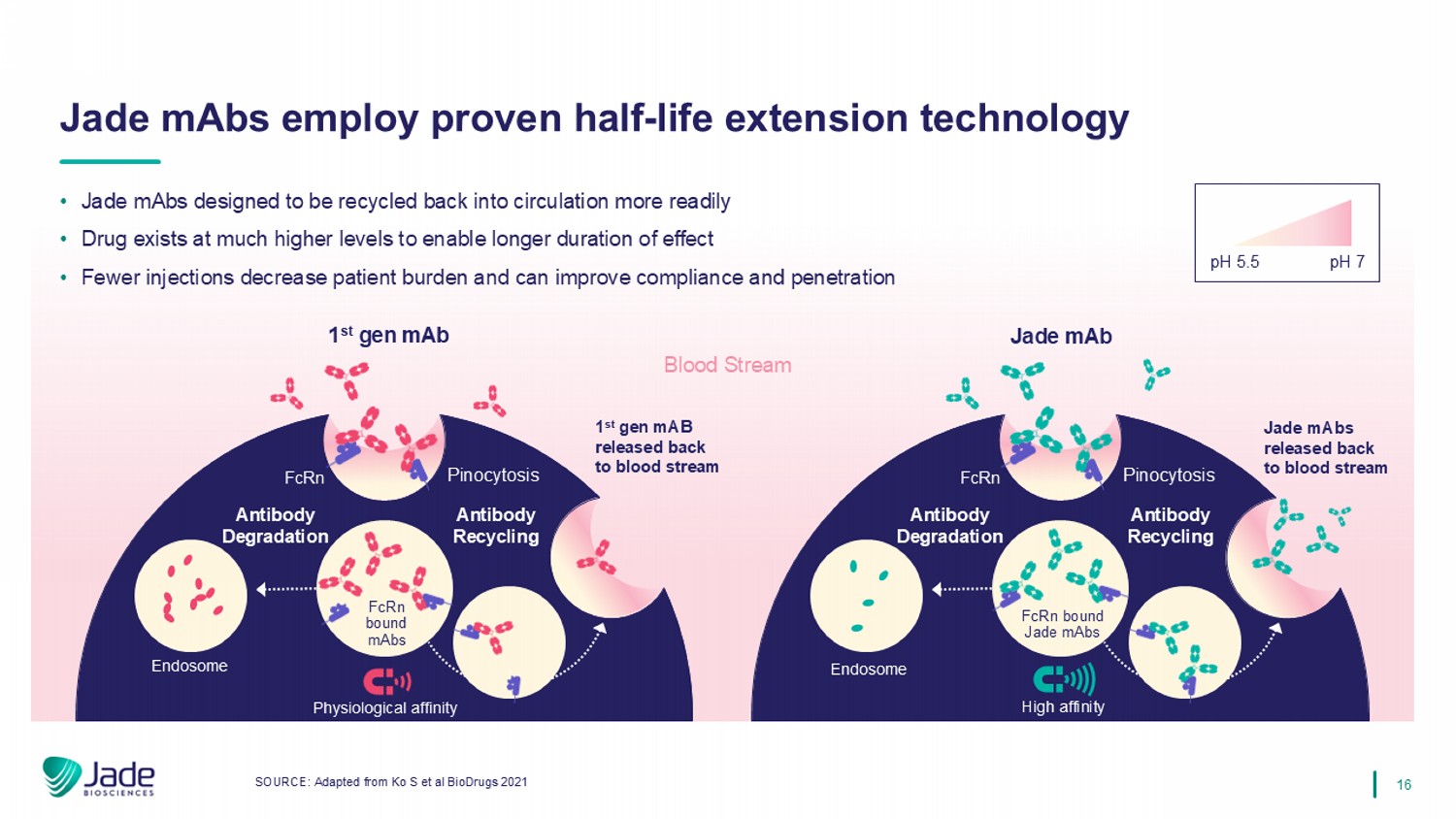 16 pH 5.5 pH 7 • Jade mAbs designed to be recycled back into circulation more readily • Drug exists at much higher levels to enable longer duration of effect • Fewer injections decrease patient burden and can improve compliance and penetration SOURCE: Adapted from Ko S et al BioDrugs 2021 Jade mAbs employ proven half - life extension technology Blood Stream Antibody Degradation Antibody Recycling Endosome 1 st gen mAb FcRn Pinocytosis Antibody Degradation Antibody Recycling Endosome Jade mAb FcRn bound Jade mAbs High affinity 1 st gen mAB released back to blood stream FcRn bound mAbs Jade mAbs released back to blood stream FcRn Pinocytosis Physiological affinity