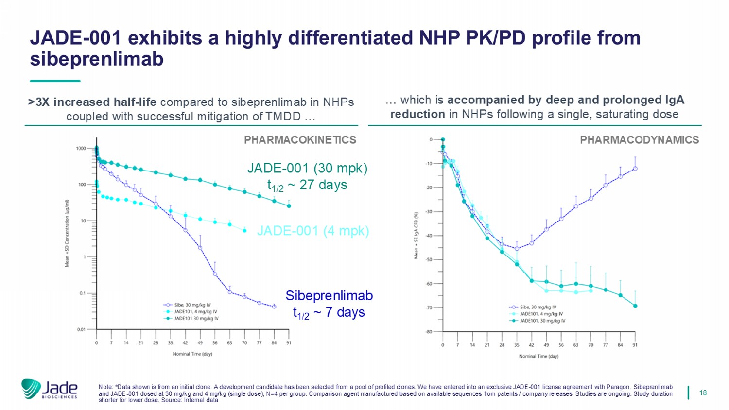 17 • High potency can potentially further drive lower dosing frequency • Already demonstrated for APRIL by sibeprenlimab’s Q4W dosing vs. zigakibart’s Q2W dosing despite near - equivalent half - life. Sources: 2019 Myette (Kidney Intl); 2022 Mathur (KI Reports); 2018 Dulos (ASN Poster); 2020 Lo (ERA Poster); Apogee Corporate Presentation *Based on single dose studies in NHPs dosed with JADE - 001 initial clone. A development candidate has been selected from a pool o f profiled clones. We have entered into an exclusive JADE - 001 license agreement with Paragon. **Available anti - APRIL therapeutics demonstrate appreciable TMDD resulting in dose and dose frequency dependent t1/2. Jade estim ated t1/2 of benchmarks from publicly available data at the P3 dose and schedule via standard noncompartmental analysis of observed data bolstered with compartmental modelling approaches capturing clinically observed TM DD. Cross - trial comparisons are inherently limited and presented for hypothesis - generating purposes only. Goal of JADE - 001 is to introduce Q8W+ dosing for patients with IgAN via well - established half - life extension technology Prior experience, including with Paragon - generated mAbs , indicates HLE c ould significantly improve dosing over anti - APRILs in development Est. Dosing Interval Human t 1/2 (days) Targeting Q8W+ JADE - 001 TPP (HLE anti - APRIL mAb ) Q4W (400 mg) Sibeprenlimab (anti - APRIL mAb ) Q2W (600 mg) Zigakibart (anti - APRIL mAb ) QW (150 mg) Atacicept (TACI - Fc APRIL/BAFF) Q4W (80 mg) Povetacicept (TACI - Fc APRIL/BAFF) ~20** ~23** 50+* HV PK expected H1 2026 6.7 3.7