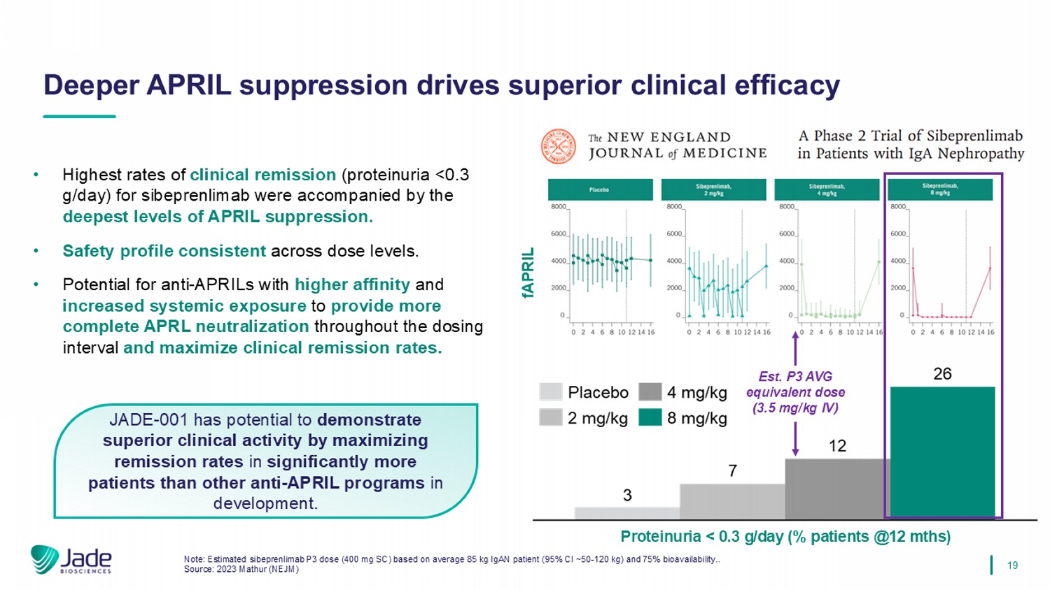18 JADE - 001 exhibits a highly differentiated NHP PK/PD profile from sibeprenlimab >3X increased half - life compared to sibeprenlimab in NHPs coupled with successful mitigation of TMDD … … which is accompanied by deep and prolonged IgA reduction in NHPs following a single, saturating dose PHARMACOKINETICS PHARMACODYNAMICS Note: *Data shown is from an initial clone. A development candidate has been selected from a pool of profiled clones. We have en tered into an exclusive JADE - 001 license agreement with Paragon. Sibeprenlimab and JADE - 001 dosed at 30 mg/kg and 4 mg/kg (single dose), N=4 per group. Comparison agent manufactured based on available sequen ces from patents / company releases. Studies are ongoing. Study duration shorter for lower dose. Source: Internal data JADE - 001 (30 mpk ) t 1/2 ~ 27 days Sibeprenlimab t 1/2 ~ 7 days JADE - 001 (4 mpk )