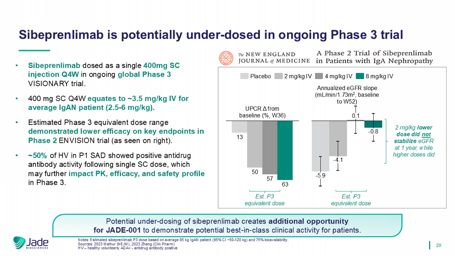 19 JADE - 001 has potential to demonstrate superior clinical activity by maximizing remission rates in significantly more patients than other anti - APRIL programs in development. • Highest rates of clinical remission (proteinuria <0.3 g/day) for sibeprenlimab were accompanied by the deepest levels of APRIL suppression. • Safety profile consistent across dose levels. • Potential for anti - APRILs with higher affinity and increased systemic exposure to provide more complete APRL neutralization throughout the dosing interval and maximize clinical remission rates. Note: Estimated sibeprenlimab P3 dose (400 mg SC) based on average 85 kg IgAN patient (95% CI ~50 - 120 kg) and 75% bioavailability.. Source: 2023 Mathur (NEJM) Deeper APRIL suppression drives superior clinical efficacy fAPRIL Est. P3 AVG equivalent dose (3.5 mg/kg IV) Proteinuria < 0.3 g/day (% patients @12 mths)