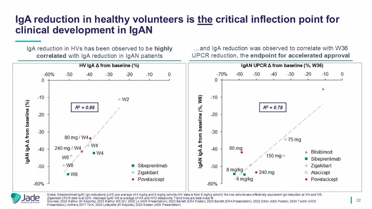 21 Potential path to early clinical proof - of - concept and accelerated approval in the US • NHP and Phase 1 PK/PD could provide early signals of clinical activity; IgA reduction in health volunteers has been observed to be highly correlated with clinical activity . • 9 - month proteinuria data predictive of kidney function preservation , supports potential for accelerated approval and faster path to market prior to eGFR confirmatory data. Proof - of - concept IgA healthy volunteer data expected in 1H 2026 Potential Indications Potential Healthy Volunteer Data Phase 1 Initiation Discovery Program MOA IgAN 1H 2026 2H 2025 Ongoing JADE - 001 anti - APRIL