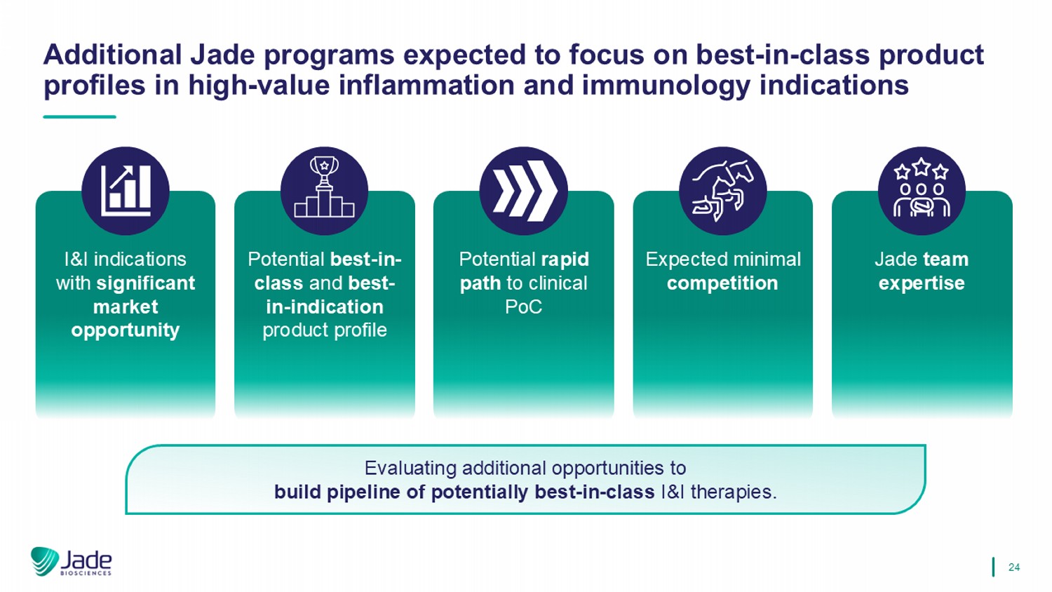 24 Additional Jade programs expected to focus on best - in - class product profiles in high - value inflammation and immunology indications I&I indications with significant market opportunity Potential best - in - class and best - in - indication product profile Potential rapid path to clinical PoC Expected minimal competition Jade team expertise Evaluating additional opportunities to build pipeline of potentially best - in - class I&I therapies.