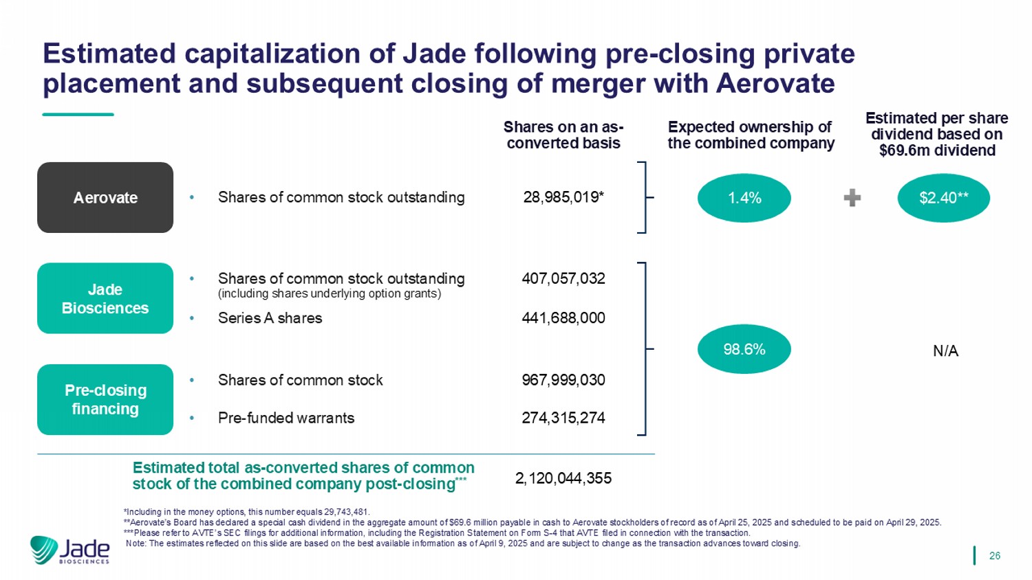 Certain statements in this communication, other than purely historical information, may constitute “forward-looking statements” within the meaning of the federal securities laws, including for purposes of the “safe harbor” provisions under the Private Securities Litigation Reform Act of 1995, concerning Aerovate, Jade, the proposed concurrent investment and the proposed Merger (collectively, the “Proposed Transactions”) and other matters. These forward-looking statements may include, but are not limited to, express or implied statements relating to Aerovate’s and Jade’s management teams’ expectations, hopes, beliefs, intentions or strategies regarding the future including, without limitation, statements regarding: the Proposed Transactions and the expected effects, perceived benefits or opportunities of the Proposed Transactions, including investment amounts from investors and expected proceeds, and related timing with respect thereto; expectations related to Aerovate’s payment of the cash dividend in connection with the proposed Merger, including the anticipated timing of the Closing of the proposed transactions (the “Closing”); the expectations regarding the ownership structure of the combined company; and the expected trading of the combined company’s stock on Nasdaq under the ticker symbol “JBIO” after the Closing. In addition, any statements that refer to projections, forecasts or other characterizations of future events or circumstances, including any underlying assumptions, are forward-looking statements. The words “opportunity,” “potential,” “milestones,” “pipeline,” “can,” “goal,” “strategy,” “target,” “anticipate,” “achieve,” “believe,” “contemplate,” “continue,” “could,” “estimate,” “expect,” “intends,” “may,” “plan,” “possible,” “project,” “should,” “will,” “would” and similar expressions (including the negatives of these terms or variations of them) may identify forward-looking statements, but the absence of these words does not mean that a statement is not forward-looking. These forward-looking statements are based on current expectations and beliefs concerning future developments and their potential effects. There can be no assurance that future developments affecting Aerovate, Jade or the Proposed Transactions will be those that have been anticipated. These forward-looking statements involve a number of risks, uncertainties (some of which are beyond Aerovate’s control) or other assumptions that may cause actual results or performance to be materially different from those expressed or implied by these forward-looking statements. These risks and uncertainties include, but are not limited to, the risk that the conditions to the Closing or consummation of the Proposed Transactions are not satisfied, including Aerovate’s failure to obtain stockholder approval for the proposed Merger; the risk that the proposed concurrent investment is not completed in a timely manner or at all; uncertainties as to the timing of the consummation of the Proposed Transactions and the ability of each of Aerovate and Jade to consummate the transactions contemplated by the Proposed Transactions; risks related to Aerovate’s continued listing on Nasdaq until closing of the Proposed Transactions and the combined company’s ability to remain listed following the Proposed Transactions; risks related to Aerovate’s and Jade’s ability to correctly estimate their respective operating expenses and expenses associated with the Proposed Transactions, as applicable, as well as uncertainties regarding the impact any delay in the closing of any of the Proposed Transactions would have on the anticipated cash resources of the resulting combined company upon closing and other events and unanticipated spending and costs that could reduce the combined company’s cash resources; the failure or delay in obtaining required approvals from any governmental or quasi-governmental entity necessary to consummate the Proposed Transactions; the occurrence of any event, change or other circumstance or condition that could give rise to the termination of the business combination between Aerovate and Jade; the effect of the announcement or pendency of the Merger on Aerovate’s or Jade’s business relationships, operating results and business generally; costs related to the Merger; the risk that as a result of adjustments to the exchange ratio, Jade stockholders and Aerovate stockholders could own more or less of the combined company than is currently anticipated; the outcome of any legal proceedings that may be instituted against Aerovate, Jade or any of their respective directors or officers related to the Merger Agreement or the transactions contemplated thereby; the ability of Aerovate and Jade to protect their respective intellectual property rights; competitive responses to the Proposed Transactions; unexpected costs, charges or expenses resulting from the Proposed Transactions; potential adverse reactions or changes to business relationships resulting from the announcement or completion of the Proposed Transactions; failure to realize certain anticipated benefits of the Proposed Transactions, including with respect to future financial and operating results; the risk that Aerovate stockholders receive more or less of the cash dividend than is currently anticipated; legislative, regulatory, political and economic developments; and those uncertainties and factors more fully described in periodic filings with the SEC, including under the heading “Risk Factors” in the Registration Statement on Form S-4 filed with the SEC and the headings “Risk Factors” and “Business” in Aerovate’s most recent Annual Report on Form 10-K for the year ended December 31, 2024, filed with the SEC on March 27, 2025, as well as discussions of potential risks, uncertainties, and other important factors in