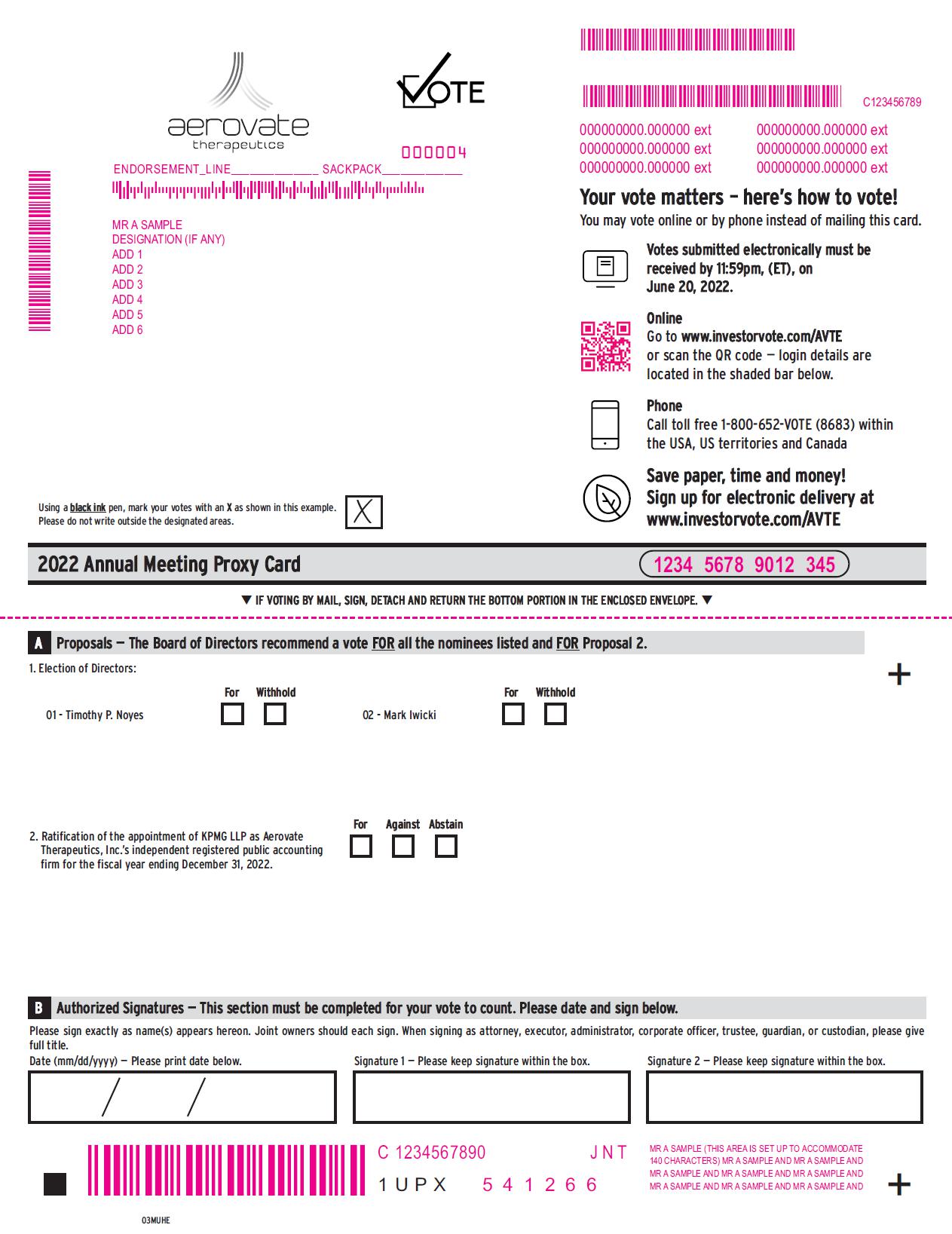 We are actively monitoring the coronavirus (COVID-19) situation and are sensitive to the public health and travel concerns our stockholders may have and the protocols that federal, state, and local governments may impose. In the event it is not possible or advisable to hold our annual meeting in person on June 21, 2022 we will announce alternative arrangements for the meeting as promptly as practicable, which may include changes to the time, place and/or manner of the meeting. Please monitor our investor relations website at http://ir.aerovatetx.com for updated information. If you are planning to attend our meeting, please check the website one week prior to the meeting date. As always, we encourage you to vote your shares prior to the annual meeting.