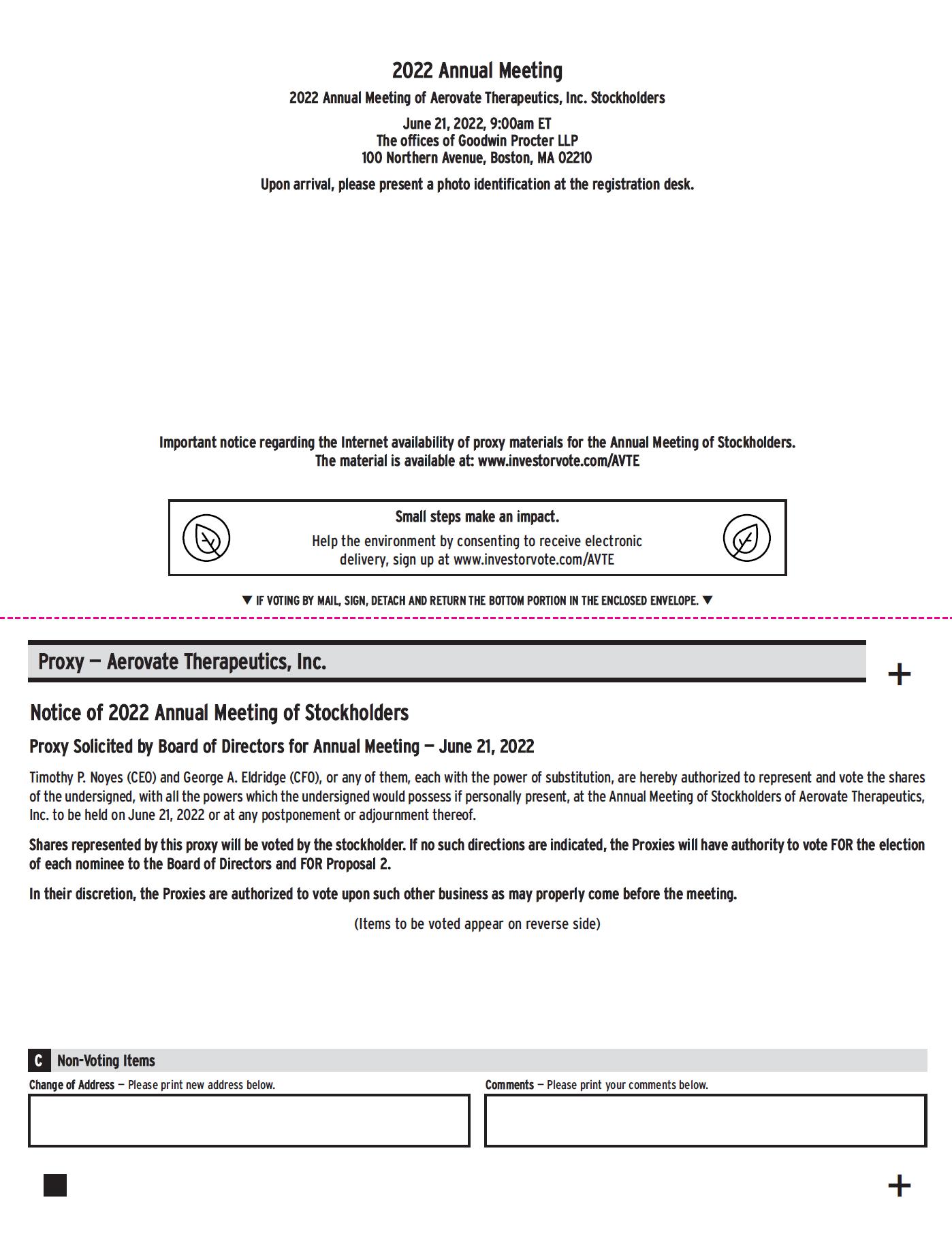Aerovate Therapeutics, Inc. is following the Securities and Exchange Commission’s “Notice and Access” rule that allows companies to furnish their proxy materials by posting them on the Internet. As a result, we are mailing to our stockholders a Notice of Internet Availability of Proxy Materials, or the Notice, instead of a paper copy of the accompanying proxy statement and our Annual Report on Form 10-K for the fiscal year ended December 31, 2021, or 2021 Annual Report. The Notice contains instructions on how to access both the 2021 Annual Report and accompanying proxy statement over the Internet. This method provides our stockholders with expedited access to proxy materials, lowers the cost of printing and distribution, and reduces the environmental impact of the Annual Meeting. If you would like to receive a print version of the proxy materials, free of charge, please follow the instructions on the Notice. If you wish to attend the Annual Meeting and vote in person, please bring the Notice with you.