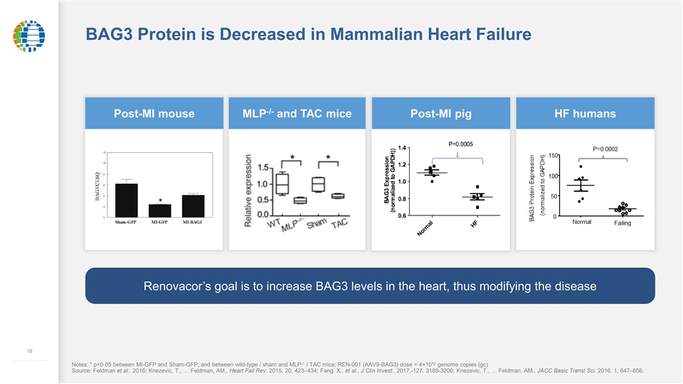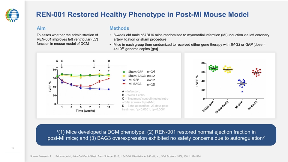 BAG3 Protein is Decreased in Mammalian Heart Failure -/- Post-MI mouse MLP and TAC mice Post-MI pig HF humans Renovacor’s goal is to increase BAG3 levels in the heart, thus modifying the disease 18 ––––––––––––– -/- 12 Notes: * p<0.05 between MI-GFP and Sham-GFP, and between wild-type / sham and MLP / TAC mice; REN-001 (AAV9-BAG3) dose = 4×10 genome copies (gc) Source: Feldman et al., 2016; Knezevic, T., … Feldman, AM., Heart Fail Rev. 2015, 20, 423–434; Fang, X., et al., J Clin Invest., 2017,-127, 3189-3200; Knezevic, T., … Feldman, AM., JACC Basic Transl Sci. 2016, 1, 647–656.BAG3 Protein is Decreased in Mammalian Heart Failure -/- Post-MI mouse MLP and TAC mice Post-MI pig HF humans Renovacor’s goal is to increase BAG3 levels in the heart, thus modifying the disease 18 ––––––––––––– -/- 12 Notes: * p<0.05 between MI-GFP and Sham-GFP, and between wild-type / sham and MLP / TAC mice; REN-001 (AAV9-BAG3) dose = 4×10 genome copies (gc) Source: Feldman et al., 2016; Knezevic, T., … Feldman, AM., Heart Fail Rev. 2015, 20, 423–434; Fang, X., et al., J Clin Invest., 2017,-127, 3189-3200; Knezevic, T., … Feldman, AM., JACC Basic Transl Sci. 2016, 1, 647–656.
