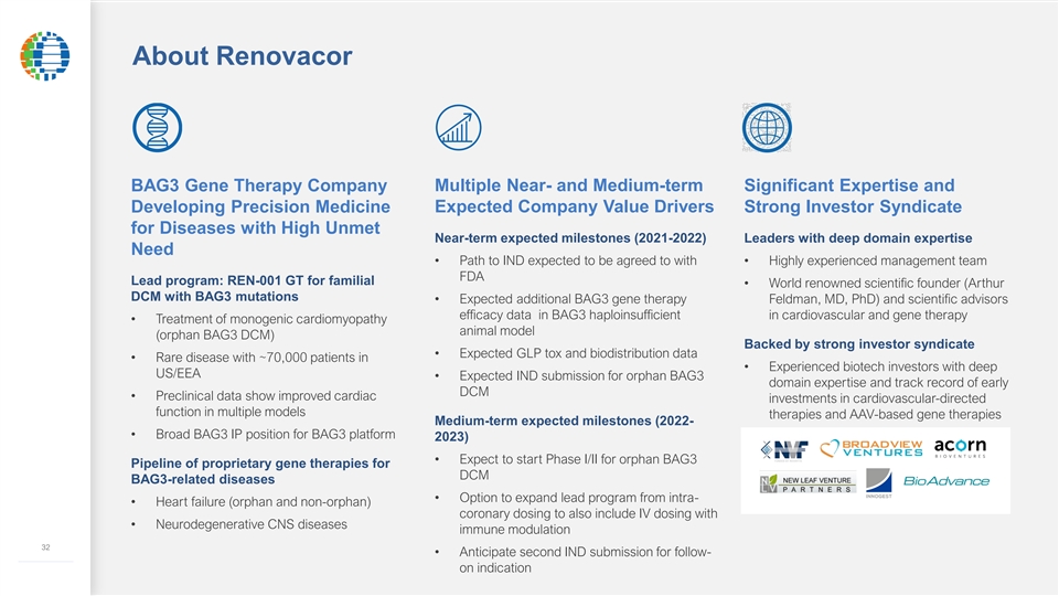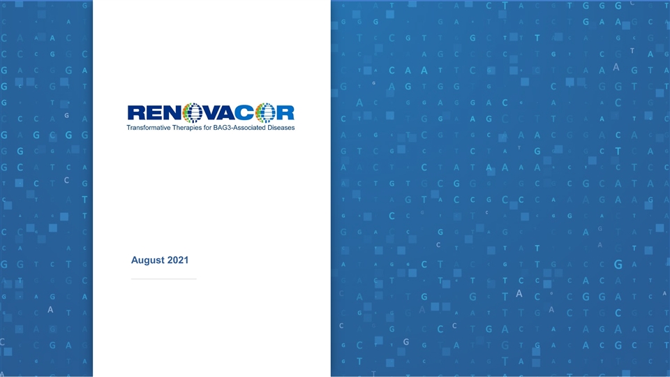 About Renovacor BAG3 Gene Therapy Company Multiple Near- and Medium-term Significant Expertise and Expected Company Value Drivers Developing Precision Medicine Strong Investor Syndicate for Diseases with High Unmet Near-term expected milestones (2021-2022) Leaders with deep domain expertise Need • Path to IND expected to be agreed to with • Highly experienced management team FDA Lead program: REN-001 GT for familial • World renowned scientific founder (Arthur DCM with BAG3 mutations • Expected additional BAG3 gene therapy Feldman, MD, PhD) and scientific advisors efficacy data in BAG3 haploinsufficient in cardiovascular and gene therapy • Treatment of monogenic cardiomyopathy animal model (orphan BAG3 DCM) Backed by strong investor syndicate • Expected GLP tox and biodistribution data • Rare disease with ~70,000 patients in • Experienced biotech investors with deep US/EEA • Expected IND submission for orphan BAG3 domain expertise and track record of early DCM • Preclinical data show improved cardiac investments in cardiovascular-directed function in multiple models therapies and AAV-based gene therapies Medium-term expected milestones (2022- • Broad BAG3 IP position for BAG3 platform 2023) • Expect to start Phase I/II for orphan BAG3 Pipeline of proprietary gene therapies for DCM BAG3-related diseases • Option to expand lead program from intra- • Heart failure (orphan and non-orphan) coronary dosing to also include IV dosing with • Neurodegenerative CNS diseases immune modulation 32 32 32 • Anticipate second IND submission for follow- ––––––––––––– ––––––––––––– on indication CONFIDENTIALAbout Renovacor BAG3 Gene Therapy Company Multiple Near- and Medium-term Significant Expertise and Expected Company Value Drivers Developing Precision Medicine Strong Investor Syndicate for Diseases with High Unmet Near-term expected milestones (2021-2022) Leaders with deep domain expertise Need • Path to IND expected to be agreed to with • Highly experienced management team FDA Lead program: REN-001 GT for familial • World renowned scientific founder (Arthur DCM with BAG3 mutations • Expected additional BAG3 gene therapy Feldman, MD, PhD) and scientific advisors efficacy data in BAG3 haploinsufficient in cardiovascular and gene therapy • Treatment of monogenic cardiomyopathy animal model (orphan BAG3 DCM) Backed by strong investor syndicate • Expected GLP tox and biodistribution data • Rare disease with ~70,000 patients in • Experienced biotech investors with deep US/EEA • Expected IND submission for orphan BAG3 domain expertise and track record of early DCM • Preclinical data show improved cardiac investments in cardiovascular-directed function in multiple models therapies and AAV-based gene therapies Medium-term expected milestones (2022- • Broad BAG3 IP position for BAG3 platform 2023) • Expect to start Phase I/II for orphan BAG3 Pipeline of proprietary gene therapies for DCM BAG3-related diseases • Option to expand lead program from intra- • Heart failure (orphan and non-orphan) coronary dosing to also include IV dosing with • Neurodegenerative CNS diseases immune modulation 32 32 32 • Anticipate second IND submission for follow- ––––––––––––– ––––––––––––– on indication CONFIDENTIAL