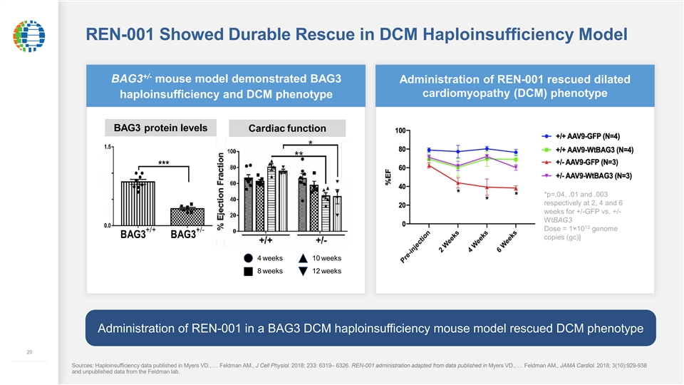 REN-001 Showed Durable Rescue in DCM Haploinsufficiency Model +/- BAG3 mouse model demonstrated BAG3 Administration of REN-001 rescued dilated cardiomyopathy (DCM) phenotype haploinsufficiency and DCM phenotype BAG3 protein levels Cardiac function *p=.04, .01 and .003 respectively at 2, 4 and 6 weeks for +/-GFP vs. +/- WtBAG3 13 Dose = 1×10 genome copies (gc)] 4 weeks 10 weeks 8 weeks 12 weeks Administration of REN-001 in a BAG3 DCM haploinsufficiency mouse model rescued DCM phenotype 20 ––––––––––––– Sources: Haploinsufficiency data published in Myers VD., … Feldman AM.,J Cell Physiol. 2018; 233: 6319– 6326. REN-001 administration adapted from data published in Myers VD., … Feldman AM., JAMA Cardiol. 2018; 3(10):929-938 and unpublished data from the Feldman lab.REN-001 Showed Durable Rescue in DCM Haploinsufficiency Model +/- BAG3 mouse model demonstrated BAG3 Administration of REN-001 rescued dilated cardiomyopathy (DCM) phenotype haploinsufficiency and DCM phenotype BAG3 protein levels Cardiac function *p=.04, .01 and .003 respectively at 2, 4 and 6 weeks for +/-GFP vs. +/- WtBAG3 13 Dose = 1×10 genome copies (gc)] 4 weeks 10 weeks 8 weeks 12 weeks Administration of REN-001 in a BAG3 DCM haploinsufficiency mouse model rescued DCM phenotype 20 ––––––––––––– Sources: Haploinsufficiency data published in Myers VD., … Feldman AM.,J Cell Physiol. 2018; 233: 6319– 6326. REN-001 administration adapted from data published in Myers VD., … Feldman AM., JAMA Cardiol. 2018; 3(10):929-938 and unpublished data from the Feldman lab.