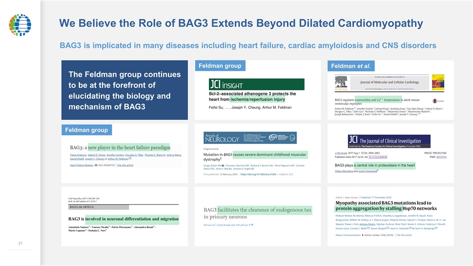 We Believe the Role of BAG3 Extends Beyond Dilated Cardiomyopathy BAG3 is implicated in many diseases including heart failure, cardiac amyloidosis and CNS disorders Feldman group Feldman et al. The Feldman group continues to be at the forefront of v v elucidating the biology and mechanism of BAG3 Feldman group v v v v v v 21 –––––––––––––We Believe the Role of BAG3 Extends Beyond Dilated Cardiomyopathy BAG3 is implicated in many diseases including heart failure, cardiac amyloidosis and CNS disorders Feldman group Feldman et al. The Feldman group continues to be at the forefront of v v elucidating the biology and mechanism of BAG3 Feldman group v v v v v v 21 –––––––––––––
