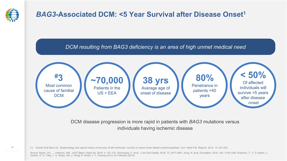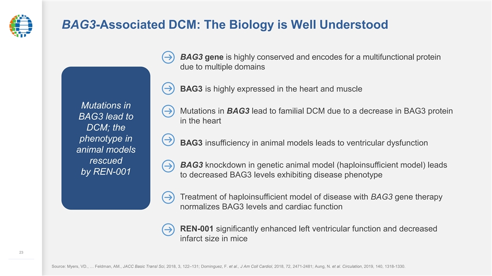 BAG3-Associated DCM: The Biology is Well Understood BAG3 gene is highly conserved and encodes for a multifunctional protein due to multiple domains BAG3 is highly expressed in the heart and muscle Mutations in Mutations in BAG3 lead to familial DCM due to a decrease in BAG3 protein BAG3 lead to in the heart DCM; the phenotype in BAG3 insufficiency in animal models leads to ventricular dysfunction animal models rescued BAG3 knockdown in genetic animal model (haploinsufficient model) leads by REN-001 to decreased BAG3 levels exhibiting disease phenotype Treatment of haploinsufficient model of disease with BAG3 gene therapy normalizes BAG3 levels and cardiac function REN-001 significantly enhanced left ventricular function and decreased infarct size in mice 23 ––––––––––––– Source: Myers, VD., … Feldman, AM., JACC Basic Transl Sci, 2018, 3, 122–131; Dominguez, F. et al., J Am Coll Cardiol, 2018, 72, 2471-2481; Aung, N. et al. Circulation, 2019, 140, 1318-1330.BAG3-Associated DCM: The Biology is Well Understood BAG3 gene is highly conserved and encodes for a multifunctional protein due to multiple domains BAG3 is highly expressed in the heart and muscle Mutations in Mutations in BAG3 lead to familial DCM due to a decrease in BAG3 protein BAG3 lead to in the heart DCM; the phenotype in BAG3 insufficiency in animal models leads to ventricular dysfunction animal models rescued BAG3 knockdown in genetic animal model (haploinsufficient model) leads by REN-001 to decreased BAG3 levels exhibiting disease phenotype Treatment of haploinsufficient model of disease with BAG3 gene therapy normalizes BAG3 levels and cardiac function REN-001 significantly enhanced left ventricular function and decreased infarct size in mice 23 ––––––––––––– Source: Myers, VD., … Feldman, AM., JACC Basic Transl Sci, 2018, 3, 122–131; Dominguez, F. et al., J Am Coll Cardiol, 2018, 72, 2471-2481; Aung, N. et al. Circulation, 2019, 140, 1318-1330.