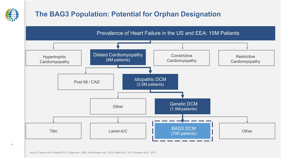 1 BAG3-Associated DCM: <5 Year Survival after Disease Onset DCM resulting from BAG3 deficiency is an area of high unmet medical need # < 50% 3 80% ~70,000 38 yrs Of affected Most common Penetrance in individuals will Patients in the Average age of cause of familial patients >40 survive >5 years US + EEA onset of disease DCM years after disease onset DCM disease progression is more rapid in patients with BAG3 mutations versus individuals having ischemic disease 24 (1) Givertz M & Mann DL. Epidemiology and natural history of recovery of left ventricular function in recent onset dilated cardiomyopathies. Curr. Heart Fail. Reports. 2013, 10: 321-220. ––––––––––––– Source: Myers, VD., … Feldman, AM., JACC Basic Transl Sci, 2018, 3, 122–131; Dominguez, F. et al., J Am Coll Cardiol, 2018, 72, 2471-2481; Aung, N. et al. Circulation, 2019, 140, 1318-1330; Knezevic, T., V. D. Myers, J. Gordon, D. G. Tilley, T. E. Sharp, 3rd, J. Wang, K. Khalili, J. Y. Cheung and A. M. Feldman (2015). 1 BAG3-Associated DCM: <5 Year Survival after Disease Onset DCM resulting from BAG3 deficiency is an area of high unmet medical need # < 50% 3 80% ~70,000 38 yrs Of affected Most common Penetrance in individuals will Patients in the Average age of cause of familial patients >40 survive >5 years US + EEA onset of disease DCM years after disease onset DCM disease progression is more rapid in patients with BAG3 mutations versus individuals having ischemic disease 24 (1) Givertz M & Mann DL. Epidemiology and natural history of recovery of left ventricular function in recent onset dilated cardiomyopathies. Curr. Heart Fail. Reports. 2013, 10: 321-220. ––––––––––––– Source: Myers, VD., … Feldman, AM., JACC Basic Transl Sci, 2018, 3, 122–131; Dominguez, F. et al., J Am Coll Cardiol, 2018, 72, 2471-2481; Aung, N. et al. Circulation, 2019, 140, 1318-1330; Knezevic, T., V. D. Myers, J. Gordon, D. G. Tilley, T. E. Sharp, 3rd, J. Wang, K. Khalili, J. Y. Cheung and A. M. Feldman (2015).