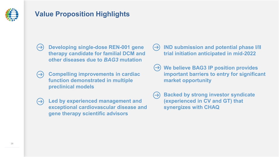 Value Proposition Highlights Developing single-dose REN-001 gene IND submission and potential phase I/II therapy candidate for familial DCM and trial initiation anticipated in mid-2022 other diseases due to BAG3 mutation We believe BAG3 IP position provides Compelling improvements in cardiac important barriers to entry for significant function demonstrated in multiple market opportunity preclinical models Backed by strong investor syndicate Led by experienced management and (experienced in CV and GT) that exceptional cardiovascular disease and synergizes with CHAQ gene therapy scientific advisors 29 –––––––––––––Value Proposition Highlights Developing single-dose REN-001 gene IND submission and potential phase I/II therapy candidate for familial DCM and trial initiation anticipated in mid-2022 other diseases due to BAG3 mutation We believe BAG3 IP position provides Compelling improvements in cardiac important barriers to entry for significant function demonstrated in multiple market opportunity preclinical models Backed by strong investor syndicate Led by experienced management and (experienced in CV and GT) that exceptional cardiovascular disease and synergizes with CHAQ gene therapy scientific advisors 29 –––––––––––––