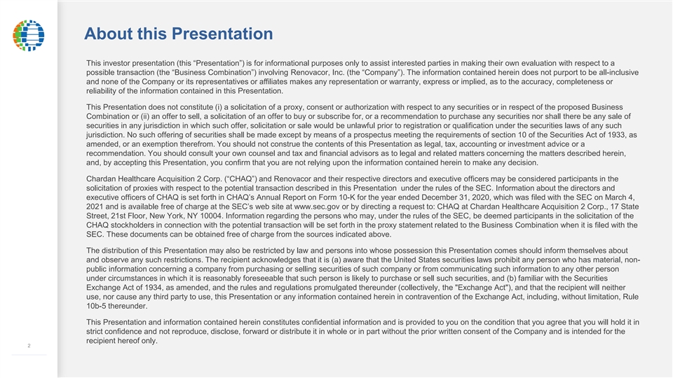 About this Presentation This investor presentation (this “Presentation”) is for informational purposes only to assist interested parties in making their own evaluation with respect to a possible transaction (the “Business Combination”) involving Renovacor, Inc. (the “Company”). The information contained herein does not purport to be all-inclusive and none of the Company or its representatives or affiliates makes any representation or warranty, express or implied, as to the accuracy, completeness or reliability of the information contained in this Presentation. This Presentation does not constitute (i) a solicitation of a proxy, consent or authorization with respect to any securities or in respect of the proposed Business Combination or (ii) an offer to sell, a solicitation of an offer to buy or subscribe for, or a recommendation to purchase any securities nor shall there be any sale of securities in any jurisdiction in which such offer, solicitation or sale would be unlawful prior to registration or qualification under the securities laws of any such jurisdiction. No such offering of securities shall be made except by means of a prospectus meeting the requirements of section 10 of the Securities Act of 1933, as amended, or an exemption therefrom. You should not construe the contents of this Presentation as legal, tax, accounting or investment advice or a recommendation. You should consult your own counsel and tax and financial advisors as to legal and related matters concerning the matters described herein, and, by accepting this Presentation, you confirm that you are not relying upon the information contained herein to make any decision. Chardan Healthcare Acquisition 2 Corp. (“CHAQ”) and Renovacor and their respective directors and executive officers may be considered participants in the solicitation of proxies with respect to the potential transaction described in this Presentation under the rules of the SEC. Information about the directors and executive officers of CHAQ is set forth in CHAQ’s Annual Report on Form 10-K for the year ended December 31, 2020, which was filed with the SEC on March 4, 2021 and is available free of charge at the SEC’s web site at www.sec.gov or by directing a request to: CHAQ at Chardan Healthcare Acquisition 2 Corp., 17 State Street, 21st Floor, New York, NY 10004. Information regarding the persons who may, under the rules of the SEC, be deemed participants in the solicitation of the CHAQ stockholders in connection with the potential transaction will be set forth in the proxy statement related to the Business Combination when it is filed with the SEC. These documents can be obtained free of charge from the sources indicated above. The distribution of this Presentation may also be restricted by law and persons into whose possession this Presentation comes should inform themselves about and observe any such restrictions. The recipient acknowledges that it is (a) aware that the United States securities laws prohibit any person who has material, non- public information concerning a company from purchasing or selling securities of such company or from communicating such information to any other person under circumstances in which it is reasonably foreseeable that such person is likely to purchase or sell such securities, and (b) familiar with the Securities Exchange Act of 1934, as amended, and the rules and regulations promulgated thereunder (collectively, the Exchange Act ), and that the recipient will neither use, nor cause any third party to use, this Presentation or any information contained herein in contravention of the Exchange Act, including, without limitation, Rule 10b-5 thereunder. This Presentation and information contained herein constitutes confidential information and is provided to you on the condition that you agree that you will hold it in strict confidence and not reproduce, disclose, forward or distribute it in whole or in part without the prior written consent of the Company and is intended for the recipient hereof only. 2 –––––––––––––About this Presentation This investor presentation (this “Presentation”) is for informational purposes only to assist interested parties in making their own evaluation with respect to a possible transaction (the “Business Combination”) involving Renovacor, Inc. (the “Company”). The information contained herein does not purport to be all-inclusive and none of the Company or its representatives or affiliates makes any representation or warranty, express or implied, as to the accuracy, completeness or reliability of the information contained in this Presentation. This Presentation does not constitute (i) a solicitation of a proxy, consent or authorization with respect to any securities or in respect of the proposed Business Combination or (ii) an offer to sell, a solicitation of an offer to buy or subscribe for, or a recommendation to purchase any securities nor shall there be any sale of securities in any jurisdiction in which such offer, solicitation or sale would be unlawful prior to registration or qualification under the securities laws of any such jurisdiction. No such offering of securities shall be made except by means of a prospectus meeting the requirements of section 10 of the Securities Act of 1933, as amended, or an exemption therefrom. You should not construe the contents of this Presentation as legal, tax, accounting or investment advice or a recommendation. You should consult your own counsel and tax and financial advisors as to legal and related matters concerning the matters described herein, and, by accepting this Presentation, you confirm that you are not relying upon the information contained herein to make any decision. Chardan Healthcare Acquisition 2 Corp. (“CHAQ”) and Renovacor and their respective directors and executive officers may be considered participants in the solicitation of proxies with respect to the potential tra