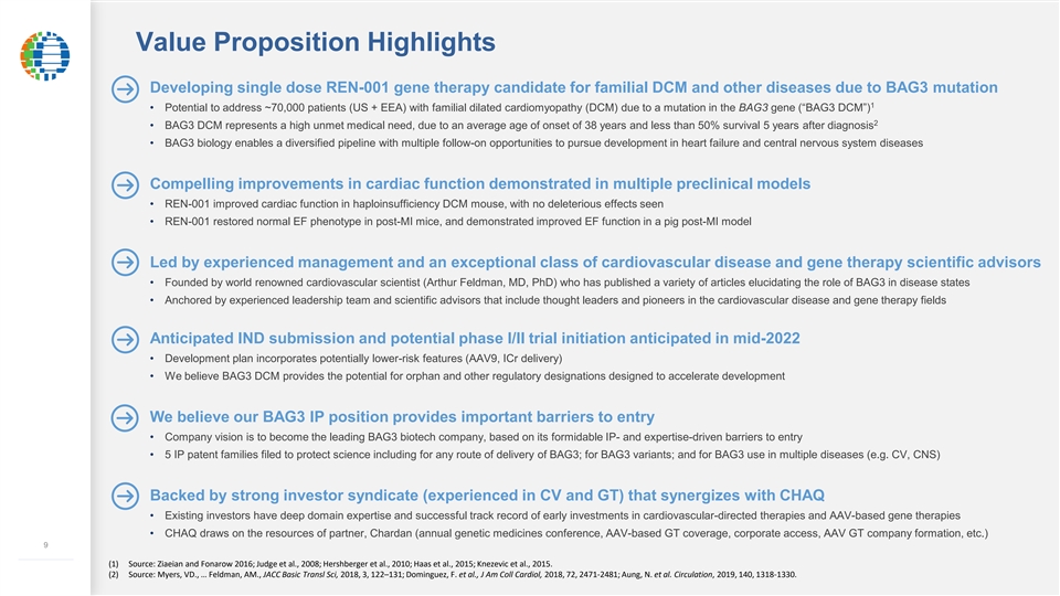 Value Proposition Highlights Developing single dose REN-001 gene therapy candidate for familial DCM and other diseases due to BAG3 mutation 1 • Potential to address ~70,000 patients (US + EEA) with familial dilated cardiomyopathy (DCM) due to a mutation in the BAG3 gene (“BAG3 DCM”) 2 • BAG3 DCM represents a high unmet medical need, due to an average age of onset of 38 years and less than 50% survival 5 years after diagnosis • BAG3 biology enables a diversified pipeline with multiple follow-on opportunities to pursue development in heart failure and central nervous system diseases Compelling improvements in cardiac function demonstrated in multiple preclinical models • REN-001 improved cardiac function in haploinsufficiency DCM mouse, with no deleterious effects seen • REN-001 restored normal EF phenotype in post-MI mice, and demonstrated improved EF function in a pig post-MI model Led by experienced management and an exceptional class of cardiovascular disease and gene therapy scientific advisors • Founded by world renowned cardiovascular scientist (Arthur Feldman, MD, PhD) who has published a variety of articles elucidating the role of BAG3 in disease states • Anchored by experienced leadership team and scientific advisors that include thought leaders and pioneers in the cardiovascular disease and gene therapy fields Anticipated IND submission and potential phase I/II trial initiation anticipated in mid-2022 • Development plan incorporates potentially lower-risk features (AAV9, ICr delivery) • We believe BAG3 DCM provides the potential for orphan and other regulatory designations designed to accelerate development We believe our BAG3 IP position provides important barriers to entry • Company vision is to become the leading BAG3 biotech company, based on its formidable IP- and expertise-driven barriers to entry • 5 IP patent families filed to protect science including for any route of delivery of BAG3; for BAG3 variants; and for BAG3 use in multiple diseases (e.g. CV, CNS) Backed by strong investor syndicate (experienced in CV and GT) that synergizes with CHAQ • Existing investors have deep domain expertise and successful track record of early investments in cardiovascular-directed therapies and AAV-based gene therapies • CHAQ draws on the resources of partner, Chardan (annual genetic medicines conference, AAV-based GT coverage, corporate access, AAV GT company formation, etc.) 9 ––––––––––––– (1) Source: Ziaeian and Fonarow 2016; Judge et al., 2008; Hershberger et al., 2010; Haas et al., 2015; Knezevic et al., 2015. (2) Source: Myers, VD., … Feldman, AM., JACC Basic Transl Sci, 2018, 3, 122–131; Dominguez, F. et al., J Am Coll Cardiol, 2018, 72, 2471-2481; Aung, N. et al. Circulation, 2019, 140, 1318-1330.Value Proposition Highlights Developing single dose REN-001 gene therapy candidate for familial DCM and other diseases due to BAG3 mutation 1 • Potential to address ~70,000 patients (US + EEA) with familial dilated cardiomyopathy (DCM) due to a mutation in the BAG3 gene (“BAG3 DCM”) 2 • BAG3 DCM represents a high unmet medical need, due to an average age of onset of 38 years and less than 50% survival 5 years after diagnosis • BAG3 biology enables a diversified pipeline with multiple follow-on opportunities to pursue development in heart failure and central nervous system diseases Compelling improvements in cardiac function demonstrated in multiple preclinical models • REN-001 improved cardiac function in haploinsufficiency DCM mouse, with no deleterious effects seen • REN-001 restored normal EF phenotype in post-MI mice, and demonstrated improved EF function in a pig post-MI model Led by experienced management and an exceptional class of cardiovascular disease and gene therapy scientific advisors • Founded by world renowned cardiovascular scientist (Arthur Feldman, MD, PhD) who has published a variety of articles elucidating the role of BAG3 in disease states • Anchored by experienced leadership team and scientific advisors that include thought leaders and pioneers in the cardiovascular disease and gene therapy fields Anticipated IND submission and potential phase I/II trial initiation anticipated in mid-2022 • Development plan incorporates potentially lower-risk features (AAV9, ICr delivery) • We believe BAG3 DCM provides the potential for orphan and other regulatory designations designed to accelerate development We believe our BAG3 IP position provides important barriers to entry • Company vision is to become the leading BAG3 biotech company, based on its formidable IP- and expertise-driven barriers to entry • 5 IP patent families filed to protect science including for any route of delivery of BAG3; for BAG3 variants; and for BAG3 use in multiple diseases (e.g. CV, CNS) Backed by strong investor syndicate (experienced in CV and GT) that synergizes with CHAQ • Existing investors have deep domain expertise and successful track record of early investments in cardiovascular-directed therapies and AAV-based gene therapies • CHAQ draws on the resources of partner, Chardan (annual genetic medicines conference, AAV-based GT coverage, corporate access, AAV GT company formation, etc.) 9 ––––––––––––– (1) Source: Ziaeian and Fonarow 2016; Judge et al., 2008; Hershberger et al., 2010; Haas et al., 2015; Knezevic et al., 2015. (2) Source: Myers, VD., … Feldman, AM., JACC Basic Transl Sci, 2018, 3, 122–131; Dominguez, F. et al., J Am Coll Cardiol, 2018, 72, 2471-2481; Aung, N. et al. Circulation, 2019, 140, 1318-1330.