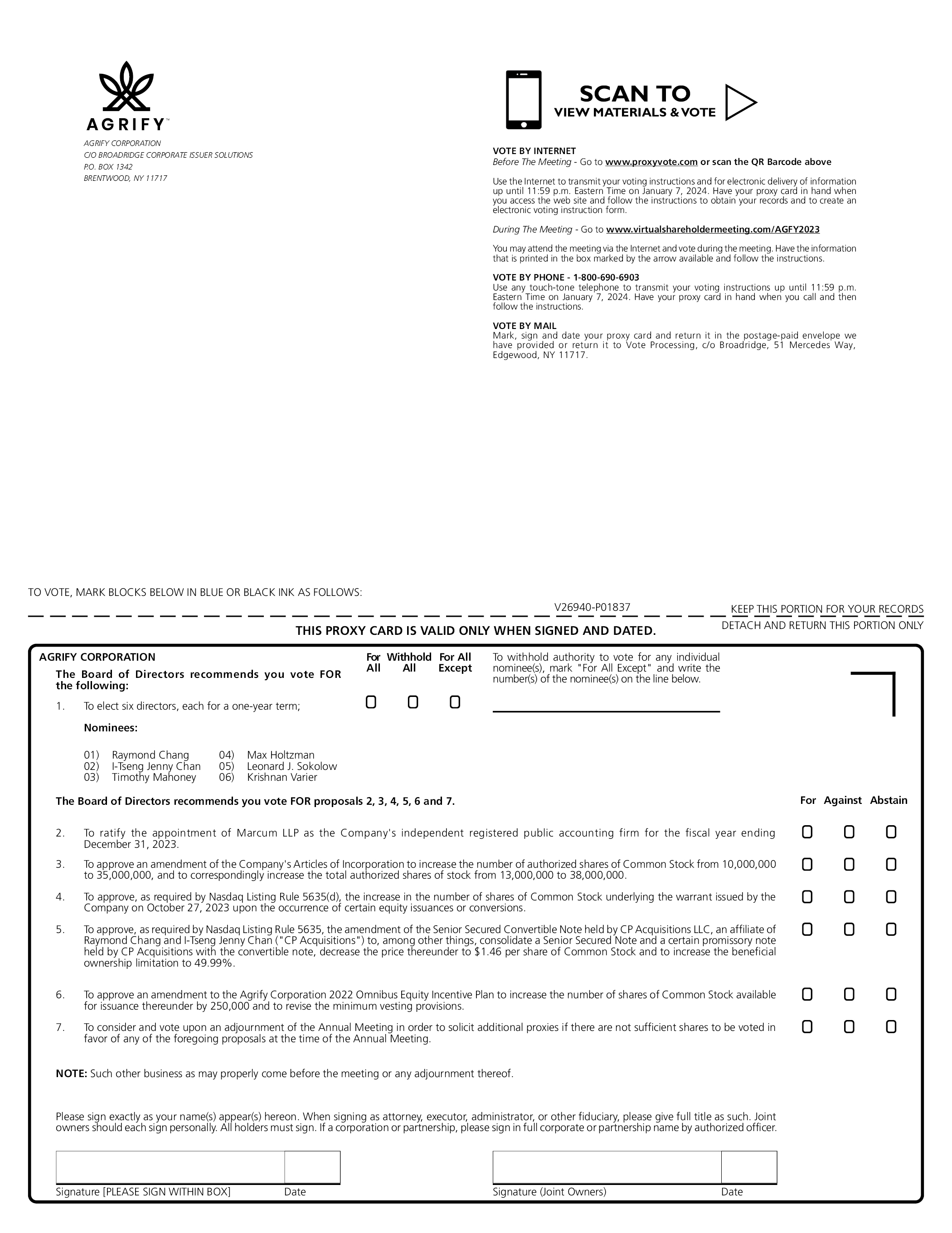 AGRIFY CORPORATION C/O BROADRIDGE CORPORATE ISSUER SOLUTIONS P.O. BOX 1342 BRENTWOOD, NY 11717 SCAN TO VIEW MATERIALS & VOTE VOTE BY INTERNET Before The Meeting - Go to www.proxyvote.com or scan the QR Barcode above Use the Internet to transmit your voting instructions and for electronic delivery of information up until 11:59 p.m. Eastern Time on January 7, 2024. Have your proxy card in hand when you access the web site and follow the instructions to obtain your records and to create an electronic voting instruction form. During The Meeting - Go to www.virtualshareholdermeeting.com/AGFY2023 You may attend the meeting via the Internet and vote during the meeting. Have the information that is printed in the box marked by the arrow available and follow the instructions. VOTE BY PHONE - 1-800-690-6903 Use any touch-tone telephone to transmit your voting instructions up until 11:59 p.m. Eastern Time on January 7, 2024. Have your proxy card in hand when you call and then follow the instructions. VOTE BY MAIL Mark, sign and date your proxy card and return it in the postage-paid envelope we have provided or return it to Vote Processing, c/o Broadridge, 51 Mercedes Way, Edgewood, NY 11717. TO VOTE, MARK BLOCKS BELOW IN BLUE OR BLACK INK AS FOLLOWS: V26940-P01837 KEEP THIS PORTION FOR YOUR RECORDS THIS PROXY CARD IS VALID ONLY WHEN SIGNED AND DATED. DETACH AND RETURN THIS PORTION ONLY AGRIFY CORPORATION For All Withhold All For All Except To withhold authority to vote for any individual nominee(s), mark “For All Except” and write the number(s) of the nominee(s) on the line below. 1. To elect six directors, each for a one-year term; Nominees: 01) Raymond Chang 02) I-Tseng Jenny Chan 03) Timothy Mahoney 04) Max Holtzman 05) Leonard J. Sokolow 06) Krishnan Varier The Board of Directors recommends you vote FOR proposals 2, 3, 4, 5, 6 and 7. 2. To ratify the appointment of Marcum LLP as the Company’s independent registered public accounting firm for the fiscal year ending December 31, 2023. 3. To approve an amendment of the Company’s Articles of Incorporation to increase the number of authorized shares of Common Stock from 10,000,000 to 35,000,000, and to correspondingly increase the total authorized shares of stock from 13,000,000 to 38,000,000. 4. To approve, as required by Nasdaq Listing Rule 5635(d), the increase in the number of shares of Common Stock underlying the warrant issued by the Company on October 27, 2023 upon the occurrence of certain equity issuances or conversions. 5. To approve, as required by Nasdaq Listing Rule 5635, the amendment of the Senior Secured Convertible Note held by CP Acquisitions LLC, an affiliate of Raymond Chang and I-Tseng Jenny Chan (“CP Acquisitions”) to, among other things, consolidate a Senior Secured Note and a certain promissory note held by CP Acquisitions with the convertible note, decrease the price thereunder to $1.46 per share of Common Stock and to increase the beneficial ownership limitation to 49.99%. 6. To approve an amendment to the Agrify Corporation 2022 Omnibus Equity Incentive Plan to increase the number of shares of Common Stock available for issuance thereunder by 250,000 and to revise the minimum vesting provisions. 7. To consider and vote upon an adjournment of the Annual Meeting in order to solicit additional proxies if there are not sufficient shares to be voted in favor of any of the foregoing proposals at the time of the Annual Meeting. Please sign exactly as your name(s) appear(s) hereon. When signing as attorney, executor, administrator, or other fiduciary, please give full title as such. Joint owners should each sign personally. All holders must sign. If a corporation or partnership, please sign in full corporate or partnership name by authorized officer. NOTE: Such other business as may properly come before the meeting or any adjournment thereof For Against Abstain Signature [PLEASE SIGN WITHIN BOX] Date Signature (Joint Owners) Date
