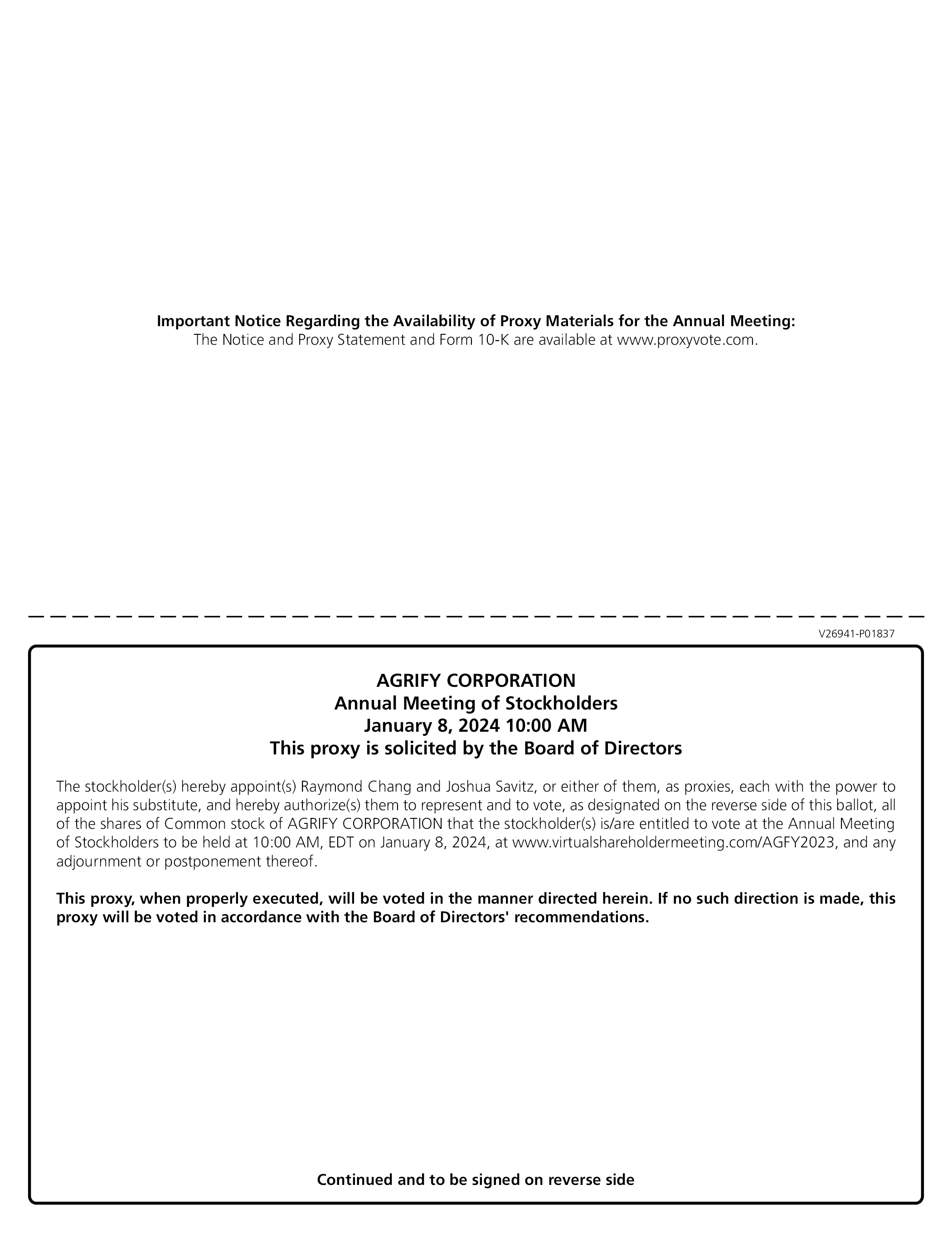 Important Notice Regarding the Availability of Proxy Materials for the Annual Meeting: The Notice and Proxy Statement and Form 10-K are available at www.proxyvote.com. V26941-P01837 AGRIFY CORPORATION Annual Meeting of Stockholders January 8, 2024 10:00 AM This proxy is solicited by the Board of Directors The stockholder(s) hereby appoint(s) Raymond Chang and Joshua Savitz, or either of them, as proxies, each with the power to appoint his substitute, and hereby authorize(s) them to represent and to vote, as designated on the reverse side of this ballot, all of the shares of Common stock of AGRIFY CORPORATION that the stockholder(s) is/are entitled to vote at the Annual Meeting of Stockholders to be held at 10:00 AM, EDT on January 8, 2024, at www.virtualshareholdermeeting.com/AGFY2023, and any adjournment or postponement thereof. This proxy, when properly executed, will be voted in the manner directed herein. If no such direction is made, this proxy will be voted in accordance with the Board of Directors’ recommendations. Continued and to be signed on reverse side