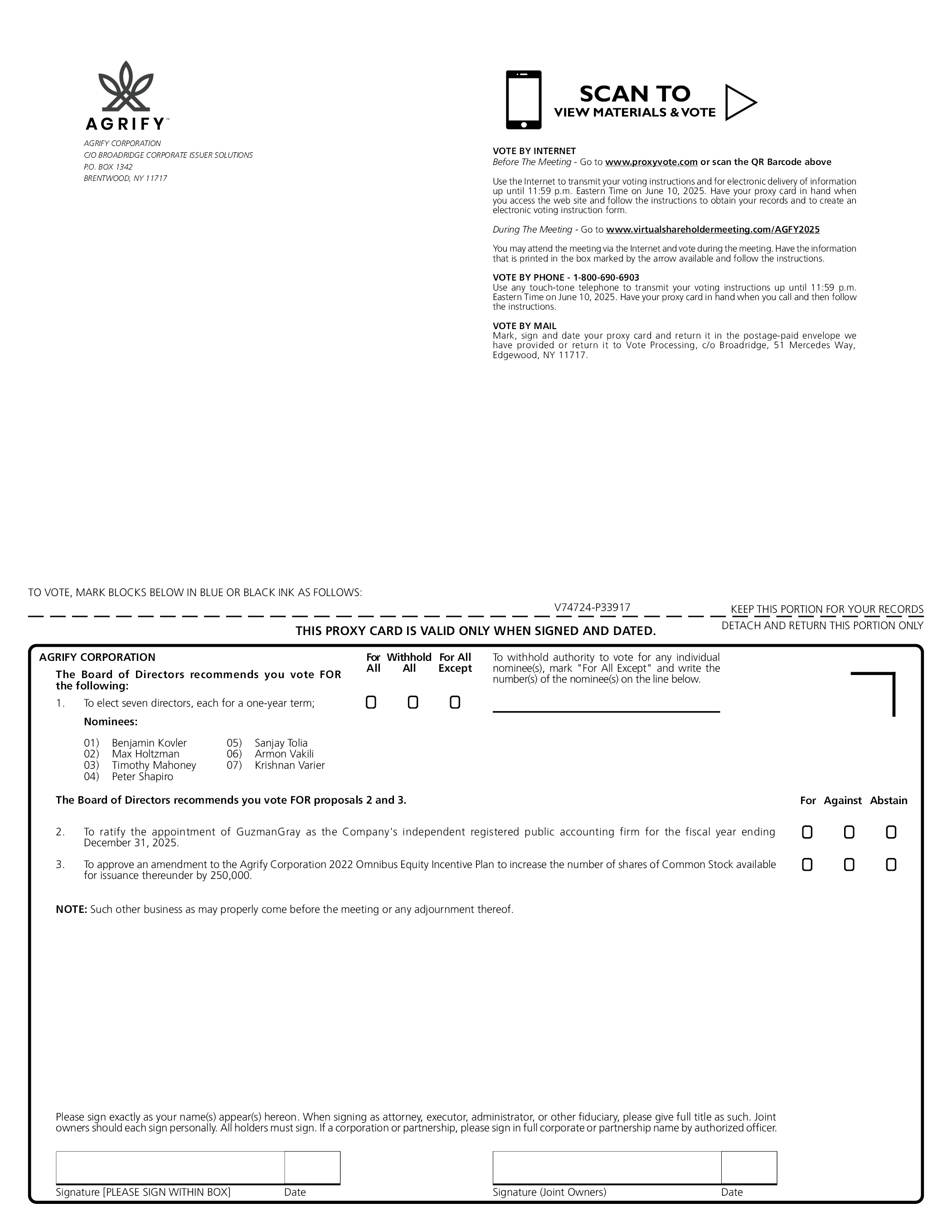 AGRIFY CORPORATION C/O BROADRIDGE CORPORATE ISSUER SOLUTIONS P.O. BOX 1342 BRENTWOOD, NY 11717 SCAN TO VIEW MATERIALS & VOTE VOTE BY INTERNET Before The Meeting - Go to www.proxyvote.com or scan the QR Barcode above Use the Internet to transmit your voting instructions and for electronic delivery of information up until 11:59 p.m. Eastern Time on June 10, 2025. Have your proxy card in hand when you access the web site and follow the instructions to obtain your records and to create an electronic voting instruction form. During The Meeting - Go to www.virtualshareholdermeeting.com/AGFY2025 You may attend the meeting via the Internet and vote during the meeting. Have the information that is printed in the box marked by the arrow available and follow the instructions. VOTE BY PHONE - 1-800-690-6903 Use any touch-tone telephone to transmit your voting instructions up until 11:59 p.m. Eastern Time on June 10, 2025. Have your proxy card in hand when you call and then follow the instructions. VOTE BY MAIL Mark, sign and date your proxy card and return it in the postage-paid envelope we have provided or return it to Vote Processing, c/o Broadridge, 51 Mercedes Way, Edgewood, NY 11717. TO VOTE, MARK BLOCKS BELOW IN BLUE OR BLACK INK AS FOLLOWS: V74724-P33917 KEEP THIS PORTION FOR YOUR RECORDS THIS PROXY CARD IS VALID ONLY WHEN SIGNED AND DATED. DETACH AND RETURN THIS PORTION ONLY AGRIFY CORPORATION For All Withhold All For All Except To withhold authority to vote for any individual nominee(s), mark “For All Except” and write the number(s) of the nominee(s) on the line below. To elect seven directors, each for a one-year term; The Board of Directors recommends you vote FOR the following: For All Withhold All For All Except 1. To elect seven directors, each for a one-year term; To withhold authority to vote for any individual nominee(s), mark “For All Except” and write the number(s) of the nominee(s) on the line below. Nominees: 01) Benjamin Kovler 02) Max Holtzman 03) Timothy Mahoney 04) Peter Shapiro 05) Sanjay Tolia 06) Armon Vakili 07) Krishnan Varier The Board of Directors recommends you vote FOR proposals 2 and 3. 2. To ratify the appointment of GuzmanGray as the Company’s independent registered public accounting firm for the fiscal year ending December 31, 2025. 3. To approve an amendment to the Agrify Corporation 2022 Omnibus Equity Incentive Plan to increase the number of shares of Common Stock available for issuance thereunder by 250,000. NOTE: Such other business as may properly come before the meeting or any adjournment thereof. For Against Abstain Please sign exactly as your name(s) appear(s) hereon. When signing as attorney, executor, administrator, or other fiduciary, please give full title as such. Joint owners should each sign personally. All holders must sign. If a corporation or partnership, please sign in full corporate or partnership name by authorized officer. Signature [PLEASE SIGN WITHIN BOX] Date Signature (Joint Owners) Date
