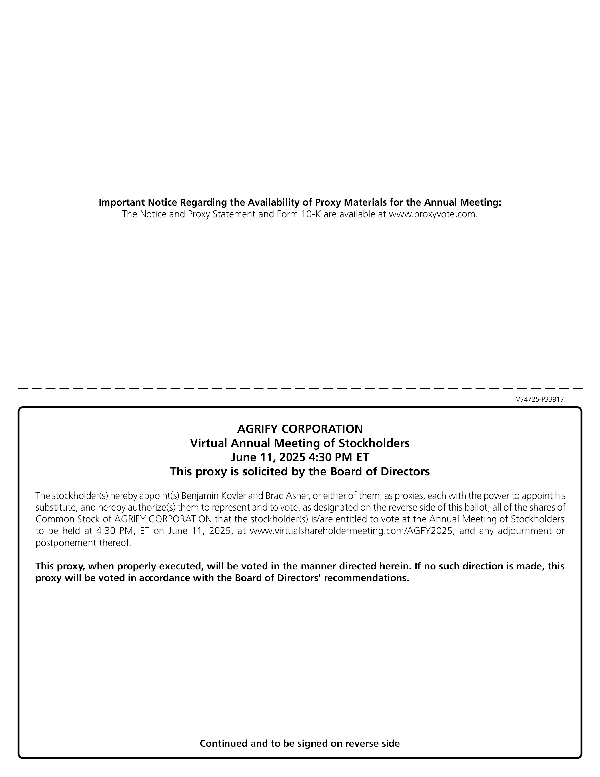 Important Notice Regarding the Availability of Proxy Materials for the Annual Meeting:The Notice and Proxy Statement and Form 10-K are available at www.proxyvote.com. Important Notice Regarding the Availability of Proxy Materials for the Annual Meeting:The Notice and Proxy Statement and Form 10-K are available at www.proxyvote.com. AGRIFY CORPORATION Virtual Annual Meeting of Stockholders June 11, 2025 4:30 PM ET This proxy is solicited by the Board of Directors The stockholder(s) hereby appoint(s) Benjamin Kovler and Brad Asher, or either of them, as proxies, each with the power to appoint his substitute, and hereby authorize(s) them to represent and to vote, as designated on the reverse side of this ballot, all of the shares of Common Stock of AGRIFY CORPORATION that the stockholder(s) is/are entitled to vote at the Annual Meeting of Stockholders to be held at 4:30 PM, ET on June 11, 2025, at www.virtualshareholdermeeting.com/AGFY2025, and any adjournment or postponement thereof. This proxy, when properly executed, will be voted in the manner directed herein. If no such direction is made, this proxy will be voted in accordance with the Board of Directors’ recommendations. Continued and to be signed on reverse side