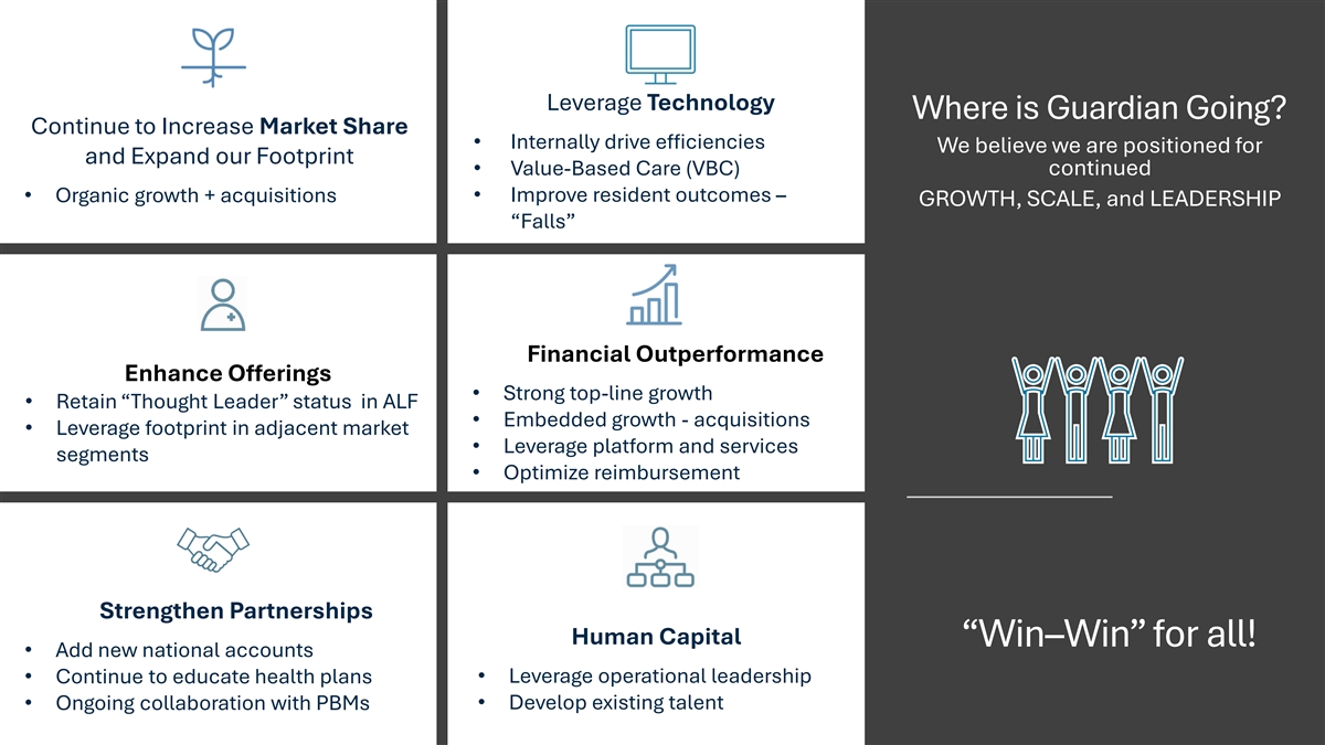 Large Population: Unique and Scalable Model: 189,000k+ (3) 53 pharmacies (1) residents (3,000+ employees) Centralized Support + Local Service Model (1) Strong Volumes: Where is Guardian Now? (2) Market Leader in the Growing ALF 27mm Rx’s Market ALF Market Leader: Industry High (4) 13% market share Adoption Rates: (1) (1) As of 03/31/2025. 88% (2) Represents the annualized run rate based on approximately 6.7 million prescriptions dispensed during the three months ended March 31, 2025. (3) As of 6/15/2025. (4) As of August 2024.