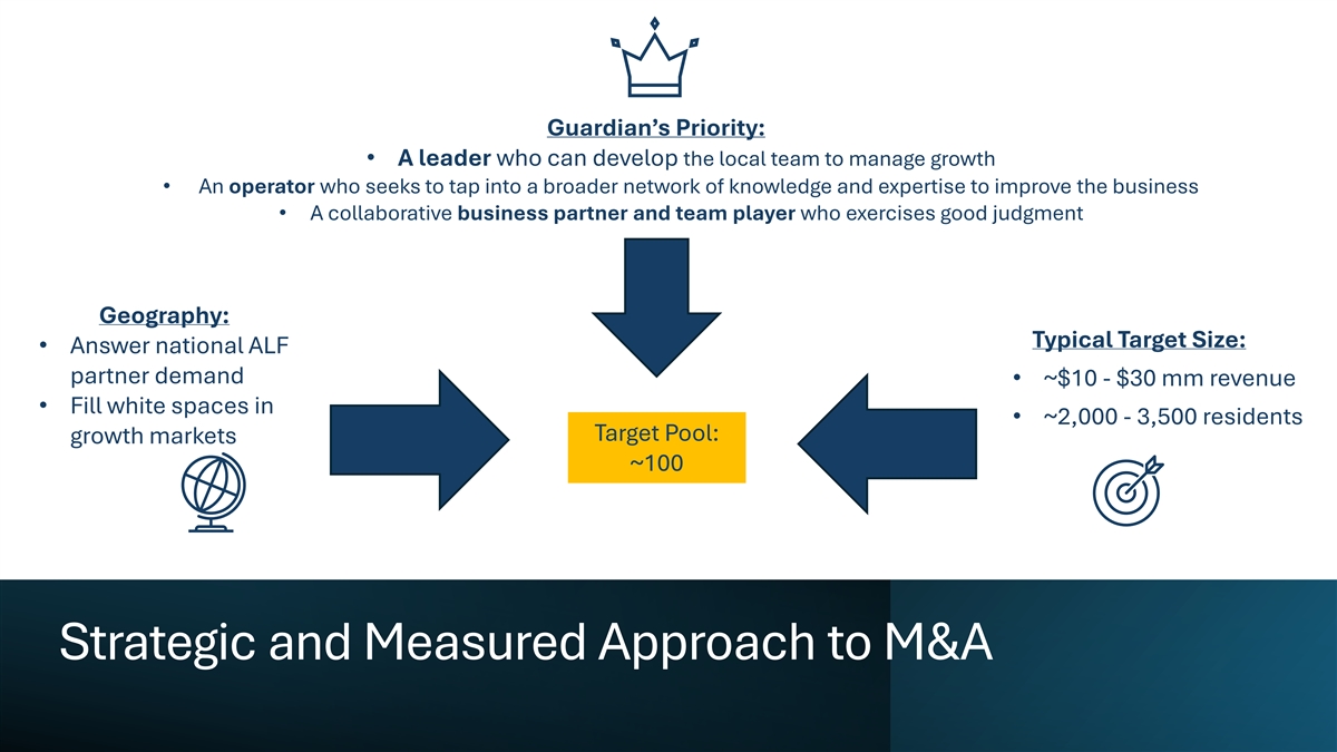 Guardian’s Priority: • A leader who can develop the local team to manage growth • An operator who seeks to tap into a broader network of knowledge and expertise to improve the business • A collaborative business partner and team player who exercises good judgment Geography: Typical Target Size: • Answer national ALF partner demand • ~$10 - $30 mm revenue • Fill white spaces in • ~2,000 - 3,500 residents Target Pool: growth markets ~100 Strategic and Measured Approach to M&A