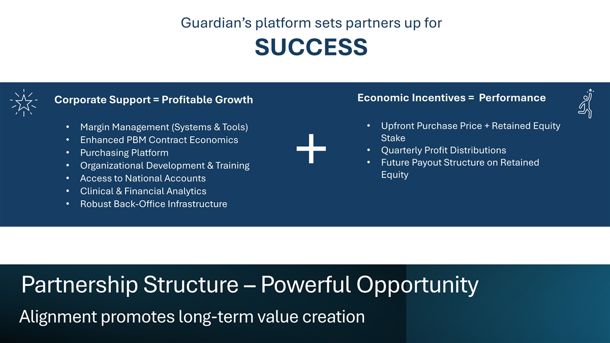Guardian’s platform sets partners up for SUCCESS Economic Incentives = Performance Corporate Support = Profitable Growth • Upfront Purchase Price + Retained Equity • Margin Management (Systems & Tools) Stake • Enhanced PBM Contract Economics • Quarterly Profit Distributions • Purchasing Platform • Future Payout Structure on Retained • Organizational Development & Training Equity • Access to National Accounts • Clinical & Financial Analytics • Robust Back-Office Infrastructure Partnership Structure – Powerful Opportunity Alignment promotes long-term value creation