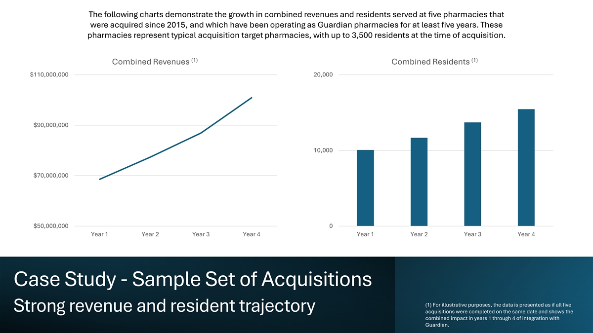 The following charts demonstrate the growth in combined revenues and residents served at five pharmacies that were acquired since 2015, and which have been operating as Guardian pharmacies for at least five years. These pharmacies represent typical acquisition target pharmacies, with up to 3,500 residents at the time of acquisition. (1) (1) Combined Revenues Combined Residents $110,000,000 20,000 $90,000,000 10,000 $70,000,000 $50,000,000 0 Year 1 Year 2 Year 3 Year 4 Year 1 Year 2 Year 3 Year 4 Case Study - Sample Set of Acquisitions (1) For illustrative purposes, the data is presented as if all five Strong revenue and resident trajectory acquisitions were completed on the same date and shows the combined impact in years 1 through 4 of integration with Guardian.