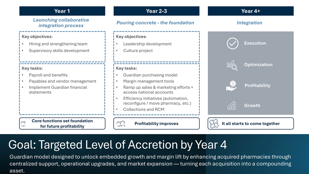 Year 1 Year 2-3 Year 4+ Launching collaborative Pouring concrete - the foundation Integration integration process Key objectives: Key objectives: Execution • Hiring and strengthening team • Leadership development • Supervisory skills development • Culture project Optimization Key tasks: Key tasks: • Payroll and benefits • Guardian purchasing model • Payables and vendor management • Margin management tools Profitability • Implement Guardian financial • Ramp up sales & marketing efforts + statements access national accounts • Efficiency initiatives (automation, reconfigure / move pharmacy, etc.) Growth • Collections and RCM Core functions set foundation Profitability improves It all starts to come together for future profitability Goal: Targeted Level of Accretion by Year 4 Guardian model designed to unlock embedded growth and margin lift by enhancing acquired pharmacies through centralized support, operational upgrades, and market expansion — turning each acquisition into a compounding asset.