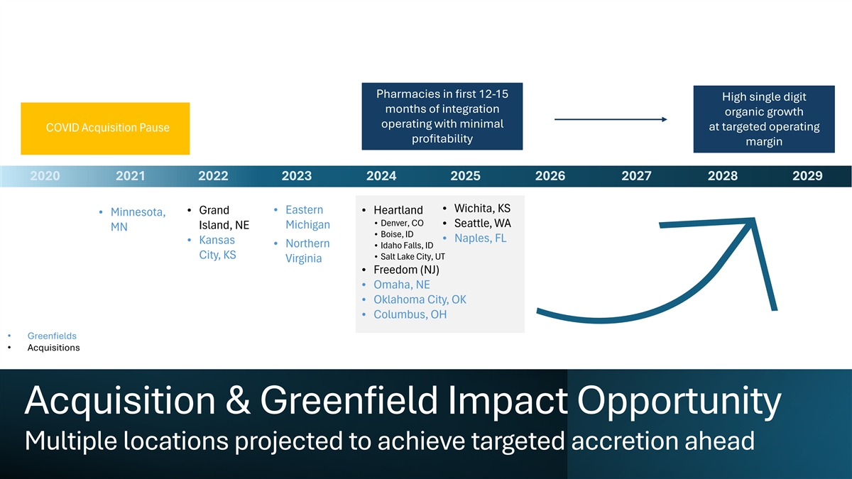 Pharmacies in first 12-15 High single digit months of integration organic growth operating with minimal at targeted operating COVID Acquisition Pause profitability margin 2020 2021 2022 2023 2024 2025 2026 2027 2028 2029 Wichita, KS • Grand Eastern Heartland • • • • Minnesota, • Denver, CO Seattle, WA • Island, NE Michigan MN • Boise, ID • Naples, FL Kansas • • Northern Idaho Falls, ID • City, KS • Salt Lake City, UT Virginia • Freedom (NJ) Omaha, NE • Oklahoma City, OK • • Columbus, OH • Greenfields • Acquisitions Acquisition & Greenfield Impact Opportunity Multiple locations projected to achieve targeted accretion ahead