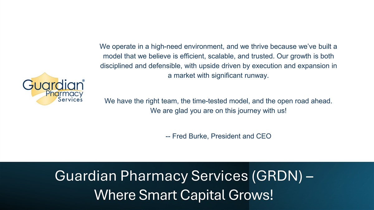 We operate in a high-need environment, and we thrive because we’ve built a model that we believe is efficient, scalable, and trusted. Our growth is both disciplined and defensible, with upside driven by execution and expansion in a market with significant runway. We have the right team, the time-tested model, and the open road ahead. We are glad you are on this journey with us! -- Fred Burke, President and CEO Guardian Pharmacy Services (GRDN) – Where Smart Capital Grows!