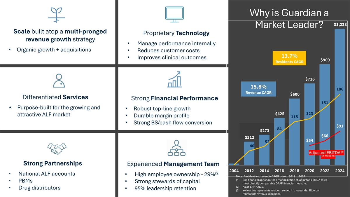 Why is Guardian a $1,228 Market Leader? Scale built atop a multi-pronged Proprietary Technology revenue growth strategy • Manage performance internally • Organic growth + acquisitions • Reduces customer costs 13.7% • Improves clinical outcomes $909 Residents CAGR $736 15.8% 186 Revenue CAGR $600 Differentiated Services Strong Financial Performance 151 • Purpose-built for the growing and • Robust top-line growth 123 $425 attractive ALF market • Durable margin profile 115 • Strong BS/cash flow conversion $91 84 $273 $66 $212 $54 52 40 (1) Adjusted EBITDA (In millions) Strong Partnerships Experienced Management Team 2004 2012 2014 2016 2018 2020 2022 2024 (2) • National ALF accounts • High employee ownership - 29% Note: Resident and revenue CAGR is from 2012 to 2024. (1) See financial appendix for a reconciliation of adjusted EBITDA to its • PBMs • Strong stewards of capital most directly comparable GAAP financial measure. (2) As of 5/31/2025. • Drug distributors • 95% leadership retention (3) Yellow line represents resident served in thousands. Blue bar represents revenue in millions.