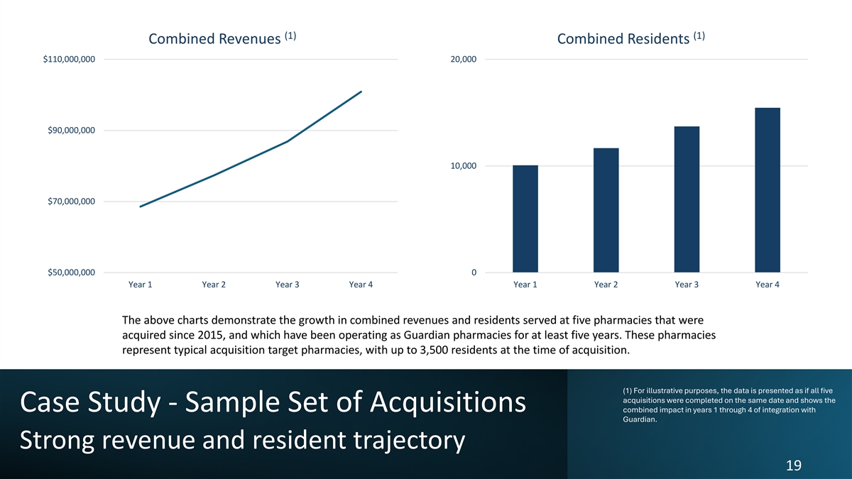 (1) (1) Combined Revenues Combined Residents $110,000,000 20,000 $90,000,000 10,000 $70,000,000 $50,000,000 0 Year 1 Year 2 Year 3 Year 4 Year 1 Year 2 Year 3 Year 4 The above charts demonstrate the growth in combined revenues and residents served at five pharmacies that were acquired since 2015, and which have been operating as Guardian pharmacies for at least five years. These pharmacies represent typical acquisition target pharmacies, with up to 3,500 residents at the time of acquisition. (1) For illustrative purposes, the data is presented as if all five acquisitions were completed on the same date and shows the Case Study - Sample Set of Acquisitions combined impact in years 1 through 4 of integration with Guardian. Strong revenue and resident trajectory 19