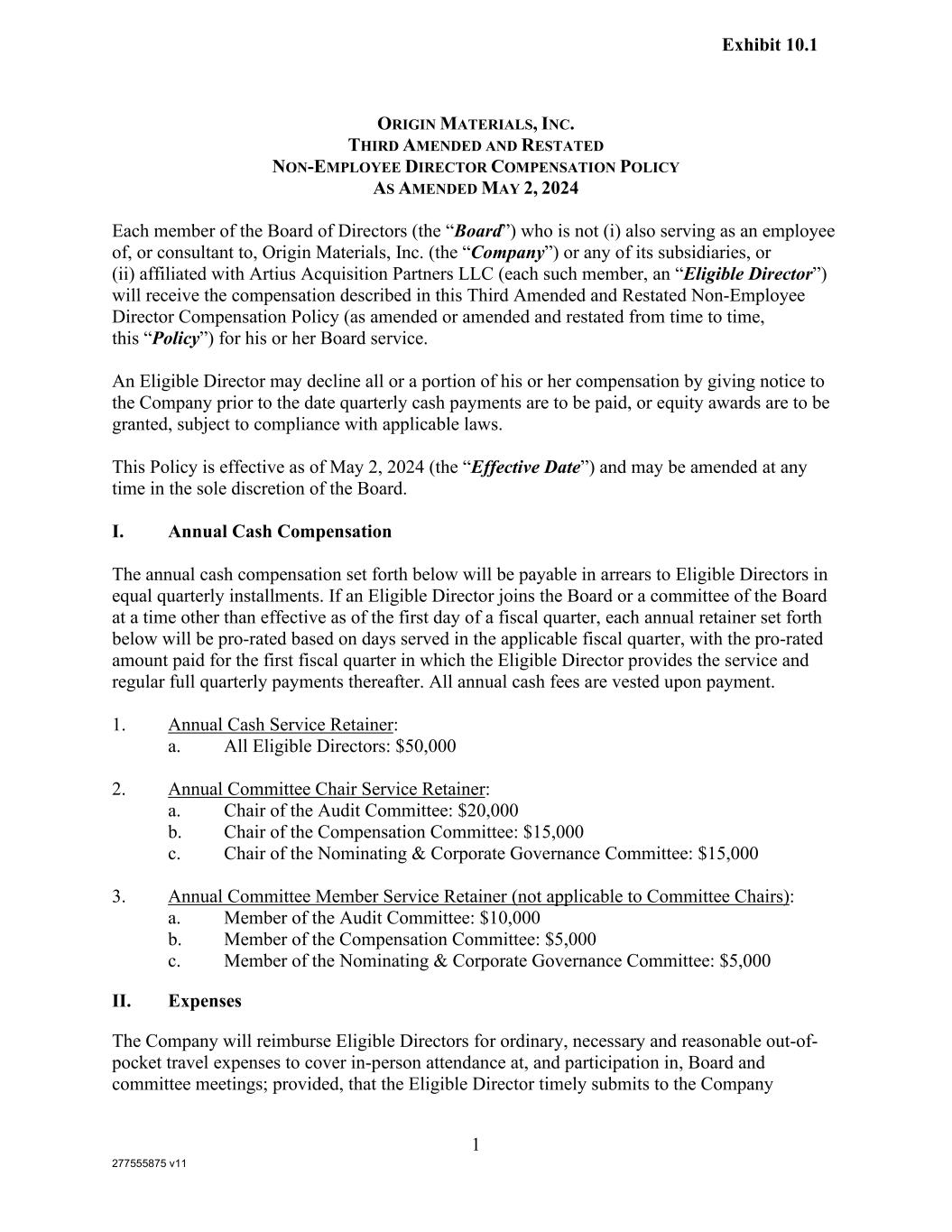 277555875 v11 1 ORIGIN MATERIALS, INC. THIRD AMENDED AND RESTATED NON-EMPLOYEE DIRECTOR COMPENSATION POLICY AS AMENDED MAY 2, 2024 Each member of the Board of Directors (the “Board”) who is not (i) also serving as an employee of, or consultant to, Origin Materials, Inc. (the “Company”) or any of its subsidiaries, or (ii) affiliated with Artius Acquisition Partners LLC (each such member, an “Eligible Director”) will receive the compensation described in this Third Amended and Restated Non-Employee Director Compensation Policy (as amended or amended and restated from time to time, this “Policy”) for his or her Board service. An Eligible Director may decline all or a portion of his or her compensation by giving notice to the Company prior to the date quarterly cash payments are to be paid, or equity awards are to be granted, subject to compliance with applicable laws. This Policy is effective as of May 2, 2024 (the “Effective Date”) and may be amended at any time in the sole discretion of the Board. I. Annual Cash Compensation The annual cash compensation set forth below will be payable in arrears to Eligible Directors in equal quarterly installments. If an Eligible Director joins the Board or a committee of the Board at a time other than effective as of the first day of a fiscal quarter, each annual retainer set forth below will be pro-rated based on days served in the applicable fiscal quarter, with the pro-rated amount paid for the first fiscal quarter in which the Eligible Director provides the service and regular full quarterly payments thereafter. All annual cash fees are vested upon payment. 1. Annual Cash Service Retainer: a. All Eligible Directors: $50,000 2. Annual Committee Chair Service Retainer: a. Chair of the Audit Committee: $20,000 b. Chair of the Compensation Committee: $15,000 c. Chair of the Nominating & Corporate Governance Committee: $15,000 3. Annual Committee Member Service Retainer (not applicable to Committee Chairs): a. Member of the Audit Committee: $10,000 b. Member of the Compensation Committee: $5,000 c. Member of the Nominating & Corporate Governance Committee: $5,000 II. Expenses The Company will reimburse Eligible Directors for ordinary, necessary and reasonable out-of- pocket travel expenses to cover in-person attendance at, and participation in, Board and committee meetings; provided, that the Eligible Director timely submits to the Company Exhibit 10.1