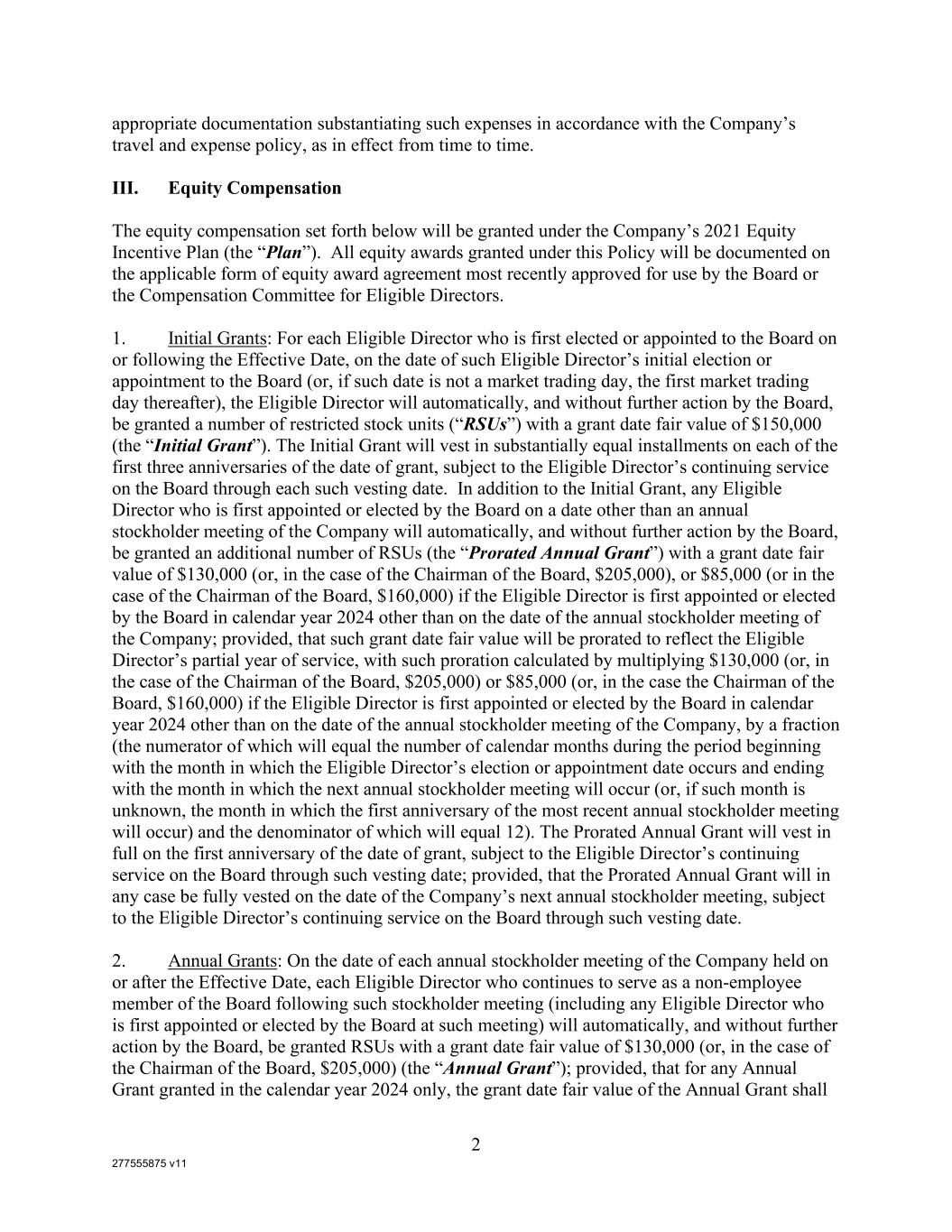 277555875 v11 2 appropriate documentation substantiating such expenses in accordance with the Company’s travel and expense policy, as in effect from time to time. III. Equity Compensation The equity compensation set forth below will be granted under the Company’s 2021 Equity Incentive Plan (the “Plan”). All equity awards granted under this Policy will be documented on the applicable form of equity award agreement most recently approved for use by the Board or the Compensation Committee for Eligible Directors. 1. Initial Grants: For each Eligible Director who is first elected or appointed to the Board on or following the Effective Date, on the date of such Eligible Director’s initial election or appointment to the Board (or, if such date is not a market trading day, the first market trading day thereafter), the Eligible Director will automatically, and without further action by the Board, be granted a number of restricted stock units (“RSUs”) with a grant date fair value of $150,000 (the “Initial Grant”). The Initial Grant will vest in substantially equal installments on each of the first three anniversaries of the date of grant, subject to the Eligible Director’s continuing service on the Board through each such vesting date. In addition to the Initial Grant, any Eligible Director who is first appointed or elected by the Board on a date other than an annual stockholder meeting of the Company will automatically, and without further action by the Board, be granted an additional number of RSUs (the “Prorated Annual Grant”) with a grant date fair value of $130,000 (or, in the case of the Chairman of the Board, $205,000), or $85,000 (or in the case of the Chairman of the Board, $160,000) if the Eligible Director is first appointed or elected by the Board in calendar year 2024 other than on the date of the annual stockholder meeting of the Company; provided, that such grant date fair value will be prorated to reflect the Eligible Director’s partial year of service, with such proration calculated by multiplying $130,000 (or, in the case of the Chairman of the Board, $205,000) or $85,000 (or, in the case the Chairman of the Board, $160,000) if the Eligible Director is first appointed or elected by the Board in calendar year 2024 other than on the date of the annual stockholder meeting of the Company, by a fraction (the numerator of which will equal the number of calendar months during the period beginning with the month in which the Eligible Director’s election or appointment date occurs and ending with the month in which the next annual stockholder meeting will occur (or, if such month is unknown, the month in which the first anniversary of the most recent annual stockholder meeting will occur) and the denominator of which will equal 12). The Prorated Annual Grant will vest in full on the first anniversary of the date of grant, subject to the Eligible Director’s continuing service on the Board through such vesting date; provided, that the Prorated Annual Grant will in any case be fully vested on the date of the Company’s next annual stockholder meeting, subject to the Eligible Director’s continuing service on the Board through such vesting date. 2. Annual Grants: On the date of each annual stockholder meeting of the Company held on or after the Effective Date, each Eligible Director who continues to serve as a non-employee member of the Board following such stockholder meeting (including any Eligible Director who is first appointed or elected by the Board at such meeting) will automatically, and without further action by the Board, be granted RSUs with a grant date fair value of $130,000 (or, in the case of the Chairman of the Board, $205,000) (the “Annual Grant”); provided, that for any Annual Grant granted in the calendar year 2024 only, the grant date fair value of the Annual Grant shall