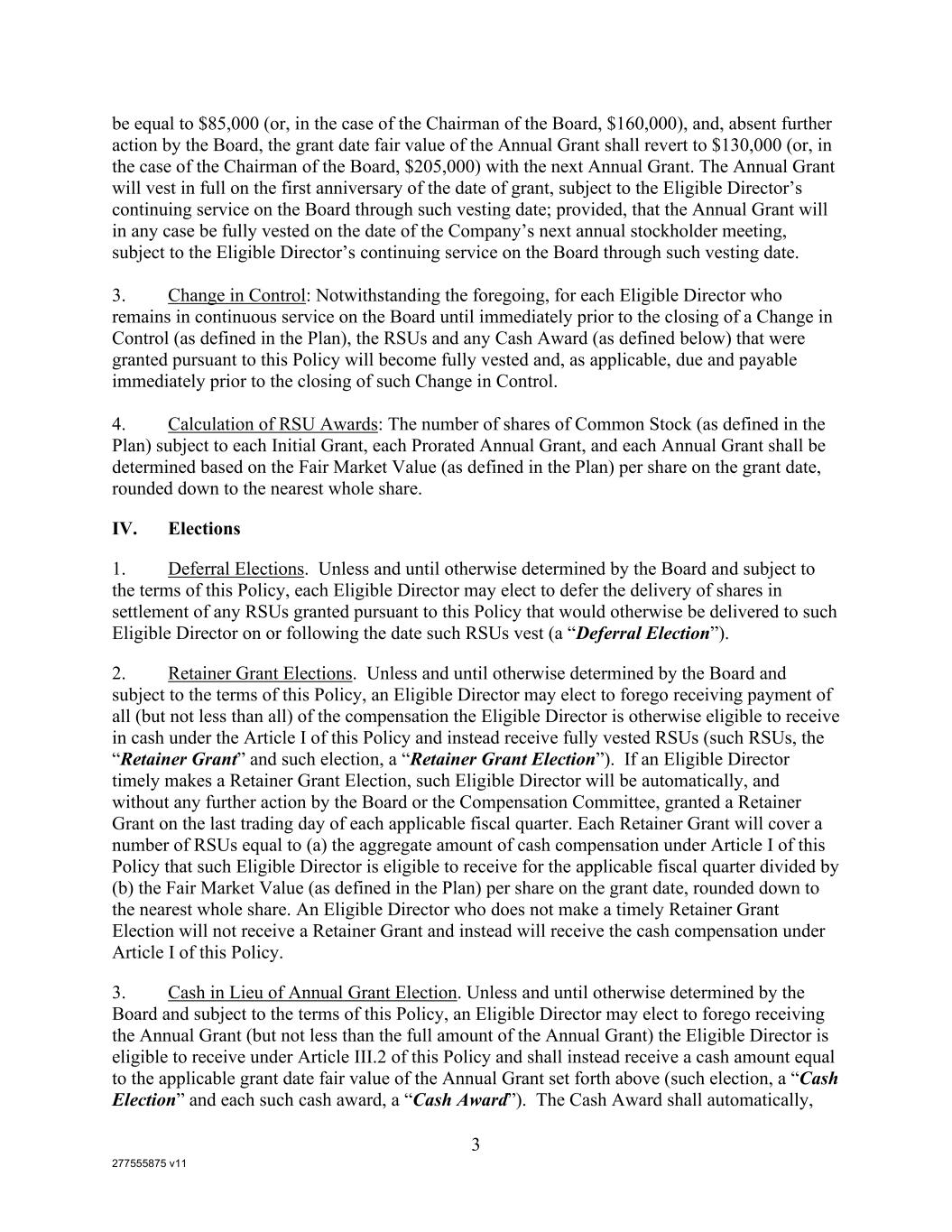 277555875 v11 3 be equal to $85,000 (or, in the case of the Chairman of the Board, $160,000), and, absent further action by the Board, the grant date fair value of the Annual Grant shall revert to $130,000 (or, in the case of the Chairman of the Board, $205,000) with the next Annual Grant. The Annual Grant will vest in full on the first anniversary of the date of grant, subject to the Eligible Director’s continuing service on the Board through such vesting date; provided, that the Annual Grant will in any case be fully vested on the date of the Company’s next annual stockholder meeting, subject to the Eligible Director’s continuing service on the Board through such vesting date. 3. Change in Control: Notwithstanding the foregoing, for each Eligible Director who remains in continuous service on the Board until immediately prior to the closing of a Change in Control (as defined in the Plan), the RSUs and any Cash Award (as defined below) that were granted pursuant to this Policy will become fully vested and, as applicable, due and payable immediately prior to the closing of such Change in Control. 4. Calculation of RSU Awards: The number of shares of Common Stock (as defined in the Plan) subject to each Initial Grant, each Prorated Annual Grant, and each Annual Grant shall be determined based on the Fair Market Value (as defined in the Plan) per share on the grant date, rounded down to the nearest whole share. IV. Elections 1. Deferral Elections. Unless and until otherwise determined by the Board and subject to the terms of this Policy, each Eligible Director may elect to defer the delivery of shares in settlement of any RSUs granted pursuant to this Policy that would otherwise be delivered to such Eligible Director on or following the date such RSUs vest (a “Deferral Election”). 2. Retainer Grant Elections. Unless and until otherwise determined by the Board and subject to the terms of this Policy, an Eligible Director may elect to forego receiving payment of all (but not less than all) of the compensation the Eligible Director is otherwise eligible to receive in cash under the Article I of this Policy and instead receive fully vested RSUs (such RSUs, the “Retainer Grant” and such election, a “Retainer Grant Election”). If an Eligible Director timely makes a Retainer Grant Election, such Eligible Director will be automatically, and without any further action by the Board or the Compensation Committee, granted a Retainer Grant on the last trading day of each applicable fiscal quarter. Each Retainer Grant will cover a number of RSUs equal to (a) the aggregate amount of cash compensation under Article I of this Policy that such Eligible Director is eligible to receive for the applicable fiscal quarter divided by (b) the Fair Market Value (as defined in the Plan) per share on the grant date, rounded down to the nearest whole share. An Eligible Director who does not make a timely Retainer Grant Election will not receive a Retainer Grant and instead will receive the cash compensation under Article I of this Policy. 3. Cash in Lieu of Annual Grant Election. Unless and until otherwise determined by the Board and subject to the terms of this Policy, an Eligible Director may elect to forego receiving the Annual Grant (but not less than the full amount of the Annual Grant) the Eligible Director is eligible to receive under Article III.2 of this Policy and shall instead receive a cash amount equal to the applicable grant date fair value of the Annual Grant set forth above (such election, a “Cash Election” and each such cash award, a “Cash Award”). The Cash Award shall automatically,