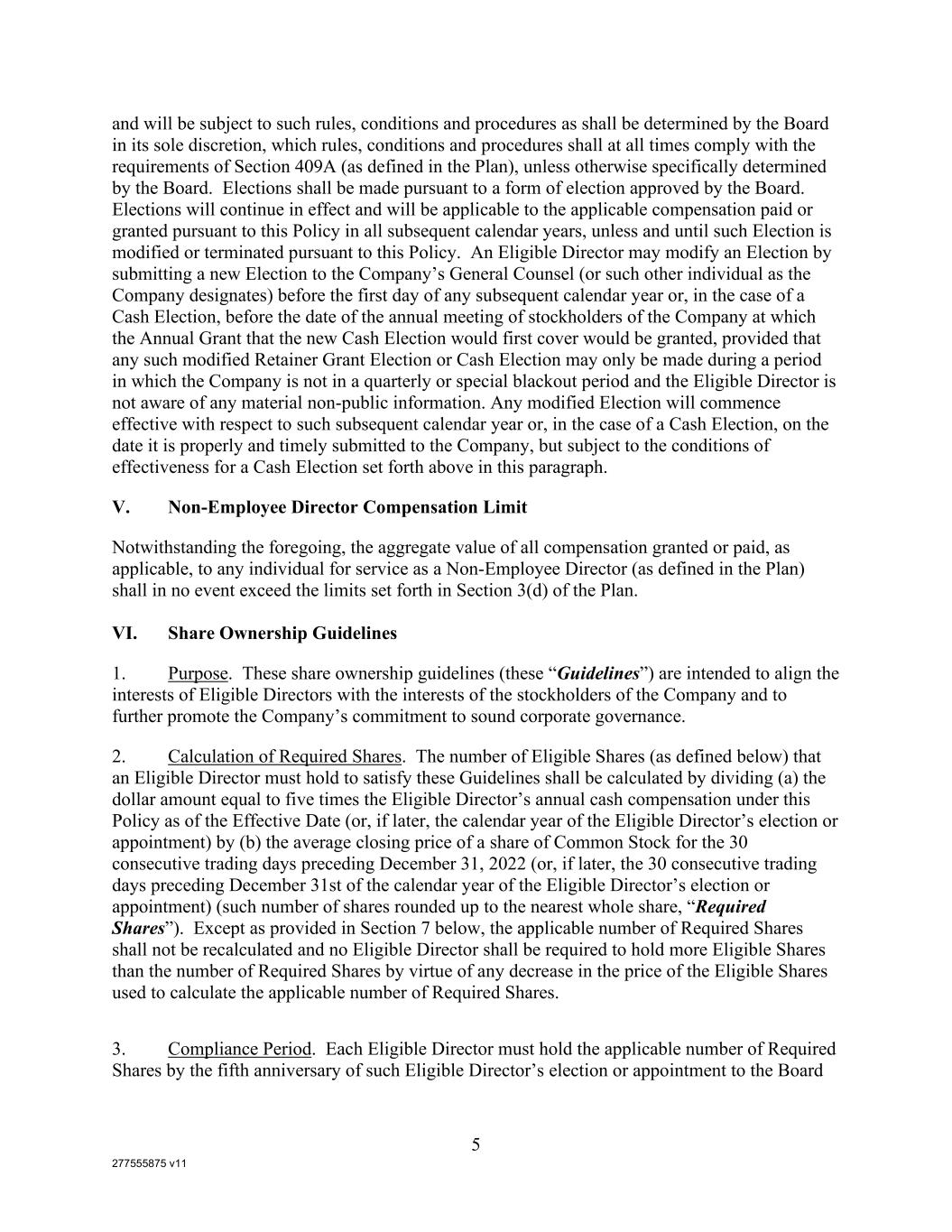 277555875 v11 5 and will be subject to such rules, conditions and procedures as shall be determined by the Board in its sole discretion, which rules, conditions and procedures shall at all times comply with the requirements of Section 409A (as defined in the Plan), unless otherwise specifically determined by the Board. Elections shall be made pursuant to a form of election approved by the Board. Elections will continue in effect and will be applicable to the applicable compensation paid or granted pursuant to this Policy in all subsequent calendar years, unless and until such Election is modified or terminated pursuant to this Policy. An Eligible Director may modify an Election by submitting a new Election to the Company’s General Counsel (or such other individual as the Company designates) before the first day of any subsequent calendar year or, in the case of a Cash Election, before the date of the annual meeting of stockholders of the Company at which the Annual Grant that the new Cash Election would first cover would be granted, provided that any such modified Retainer Grant Election or Cash Election may only be made during a period in which the Company is not in a quarterly or special blackout period and the Eligible Director is not aware of any material non-public information. Any modified Election will commence effective with respect to such subsequent calendar year or, in the case of a Cash Election, on the date it is properly and timely submitted to the Company, but subject to the conditions of effectiveness for a Cash Election set forth above in this paragraph. V. Non-Employee Director Compensation Limit Notwithstanding the foregoing, the aggregate value of all compensation granted or paid, as applicable, to any individual for service as a Non-Employee Director (as defined in the Plan) shall in no event exceed the limits set forth in Section 3(d) of the Plan. VI. Share Ownership Guidelines 1. Purpose. These share ownership guidelines (these “Guidelines”) are intended to align the interests of Eligible Directors with the interests of the stockholders of the Company and to further promote the Company’s commitment to sound corporate governance. 2. Calculation of Required Shares. The number of Eligible Shares (as defined below) that an Eligible Director must hold to satisfy these Guidelines shall be calculated by dividing (a) the dollar amount equal to five times the Eligible Director’s annual cash compensation under this Policy as of the Effective Date (or, if later, the calendar year of the Eligible Director’s election or appointment) by (b) the average closing price of a share of Common Stock for the 30 consecutive trading days preceding December 31, 2022 (or, if later, the 30 consecutive trading days preceding December 31st of the calendar year of the Eligible Director’s election or appointment) (such number of shares rounded up to the nearest whole share, “Required Shares”). Except as provided in Section 7 below, the applicable number of Required Shares shall not be recalculated and no Eligible Director shall be required to hold more Eligible Shares than the number of Required Shares by virtue of any decrease in the price of the Eligible Shares used to calculate the applicable number of Required Shares. 3. Compliance Period. Each Eligible Director must hold the applicable number of Required Shares by the fifth anniversary of such Eligible Director’s election or appointment to the Board