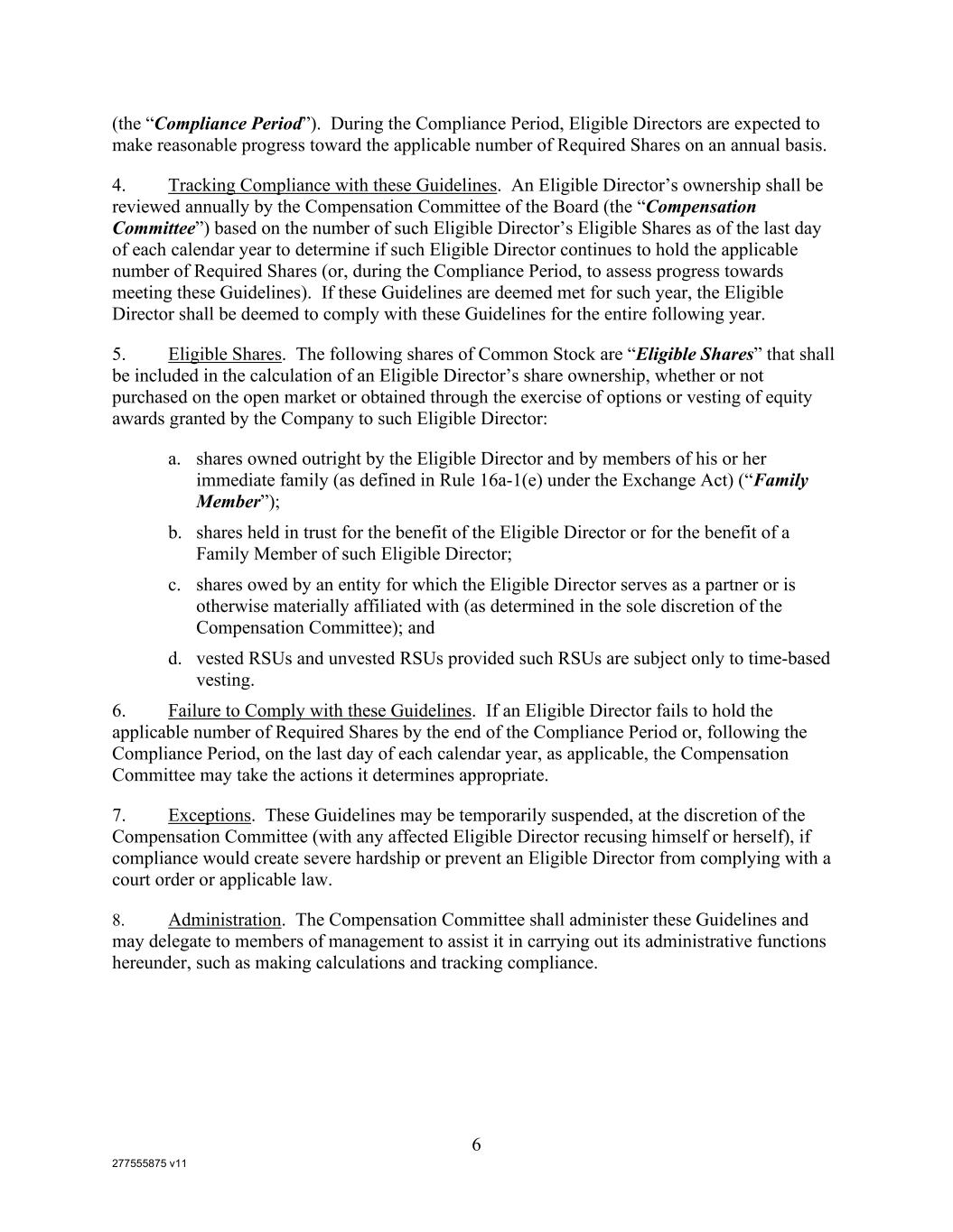 277555875 v11 6 (the “Compliance Period”). During the Compliance Period, Eligible Directors are expected to make reasonable progress toward the applicable number of Required Shares on an annual basis. 4. Tracking Compliance with these Guidelines. An Eligible Director’s ownership shall be reviewed annually by the Compensation Committee of the Board (the “Compensation Committee”) based on the number of such Eligible Director’s Eligible Shares as of the last day of each calendar year to determine if such Eligible Director continues to hold the applicable number of Required Shares (or, during the Compliance Period, to assess progress towards meeting these Guidelines). If these Guidelines are deemed met for such year, the Eligible Director shall be deemed to comply with these Guidelines for the entire following year. 5. Eligible Shares. The following shares of Common Stock are “Eligible Shares” that shall be included in the calculation of an Eligible Director’s share ownership, whether or not purchased on the open market or obtained through the exercise of options or vesting of equity awards granted by the Company to such Eligible Director: a. shares owned outright by the Eligible Director and by members of his or her immediate family (as defined in Rule 16a-1(e) under the Exchange Act) (“Family Member”); b. shares held in trust for the benefit of the Eligible Director or for the benefit of a Family Member of such Eligible Director; c. shares owed by an entity for which the Eligible Director serves as a partner or is otherwise materially affiliated with (as determined in the sole discretion of the Compensation Committee); and d. vested RSUs and unvested RSUs provided such RSUs are subject only to time-based vesting. 6. Failure to Comply with these Guidelines. If an Eligible Director fails to hold the applicable number of Required Shares by the end of the Compliance Period or, following the Compliance Period, on the last day of each calendar year, as applicable, the Compensation Committee may take the actions it determines appropriate. 7. Exceptions. These Guidelines may be temporarily suspended, at the discretion of the Compensation Committee (with any affected Eligible Director recusing himself or herself), if compliance would create severe hardship or prevent an Eligible Director from complying with a court order or applicable law. 8. Administration. The Compensation Committee shall administer these Guidelines and may delegate to members of management to assist it in carrying out its administrative functions hereunder, such as making calculations and tracking compliance.