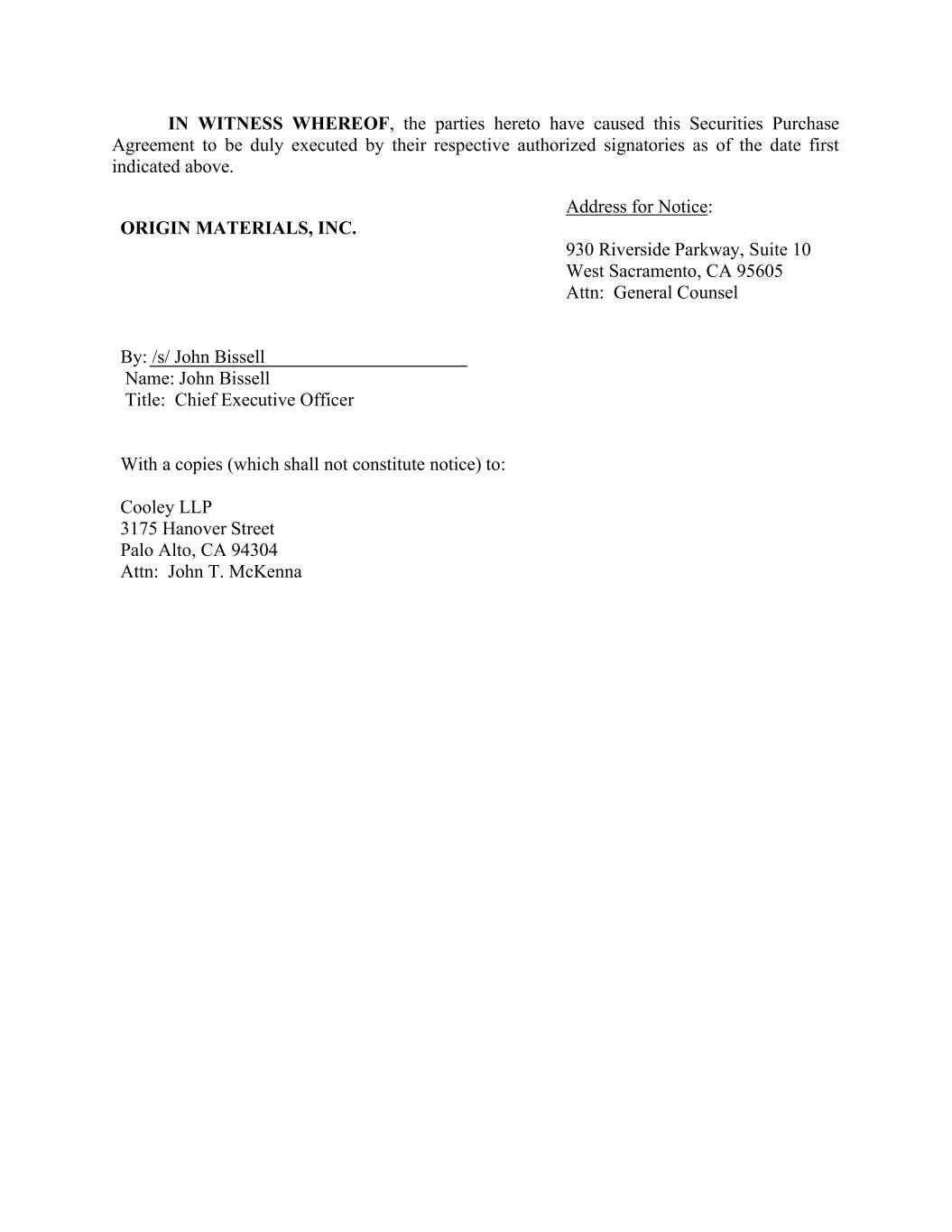IN WITNESS WHEREOF, the parties hereto have caused this Securities Purchase Agreement to be duly executed by their respective authorized signatories as of the date first indicated above. ORIGIN MATERIALS, INC. Address for Notice: 930 Riverside Parkway, Suite 10 West Sacramento, CA 95605 Attn: General Counsel By: /s/ John Bissell Name: John Bissell Title: Chief Executive Officer With a copies (which shall not constitute notice) to: Cooley LLP 3175 Hanover Street Palo Alto, CA 94304 Attn: John T. McKenna