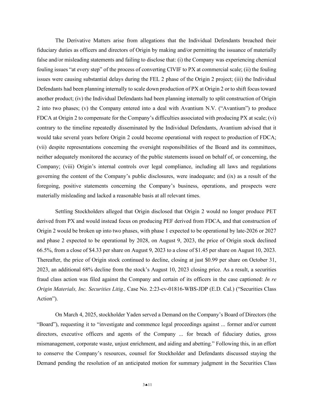 3♠11 The Derivative Matters arise from allegations that the Individual Defendants breached their fiduciary duties as officers and directors of Origin by making and/or permitting the issuance of materially false and/or misleading statements and failing to disclose that: (i) the Company was experiencing chemical fouling issues “at every step” of the process of converting ClVIF to PX at commercial scale; (ii) the fouling issues were causing substantial delays during the FEL 2 phase of the Origin 2 project; (iii) the Individual Defendants had been planning internally to scale down production of PX at Origin 2 or to shift focus toward another product; (iv) the Individual Defendants had been planning internally to split construction of Origin 2 into two phases; (v) the Company entered into a deal with Avantium N.V. (“Avantium”) to produce FDCA at Origin 2 to compensate for the Company’s difficulties associated with producing PX at scale; (vi) contrary to the timeline repeatedly disseminated by the Individual Defendants, Avantium advised that it would take several years before Origin 2 could become operational with respect to production of FDCA; (vii) despite representations concerning the oversight responsibilities of the Board and its committees, neither adequately monitored the accuracy of the public statements issued on behalf of, or concerning, the Company; (viii) Origin’s internal controls over legal compliance, including all laws and regulations governing the content of the Company’s public disclosures, were inadequate; and (ix) as a result of the foregoing, positive statements concerning the Company’s business, operations, and prospects were materially misleading and lacked a reasonable basis at all relevant times. Settling Stockholders alleged that Origin disclosed that Origin 2 would no longer produce PET derived from PX and would instead focus on producing PEF derived from FDCA, and that construction of Origin 2 would be broken up into two phases, with phase 1 expected to be operational by late-2026 or 2027 and phase 2 expected to be operational by 2028, on August 9, 2023, the price of Origin stock declined 66.5%, from a close of $4.33 per share on August 9, 2023 to a close of $1.45 per share on August 10, 2023. Thereafter, the price of Origin stock continued to decline, closing at just $0.99 per share on October 31, 2023, an additional 68% decline from the stock’s August 10, 2023 closing price. As a result, a securities fraud class action was filed against the Company and certain of its officers in the case captioned: In re Origin Materials, Inc. Securities Litig., Case No. 2:23-cv-01816-WBS-JDP (E.D. Cal.) (“Securities Class Action”). On March 4, 2025, stockholder Yaden served a Demand on the Company’s Board of Directors (the “Board”), requesting it to “investigate and commence legal proceedings against ... former and/or current directors, executive officers and agents of the Company ... for breach of fiduciary duties, gross mismanagement, corporate waste, unjust enrichment, and aiding and abetting.” Following this, in an effort to conserve the Company’s resources, counsel for Stockholder and Defendants discussed staying the Demand pending the resolution of an anticipated motion for summary judgment in the Securities Class