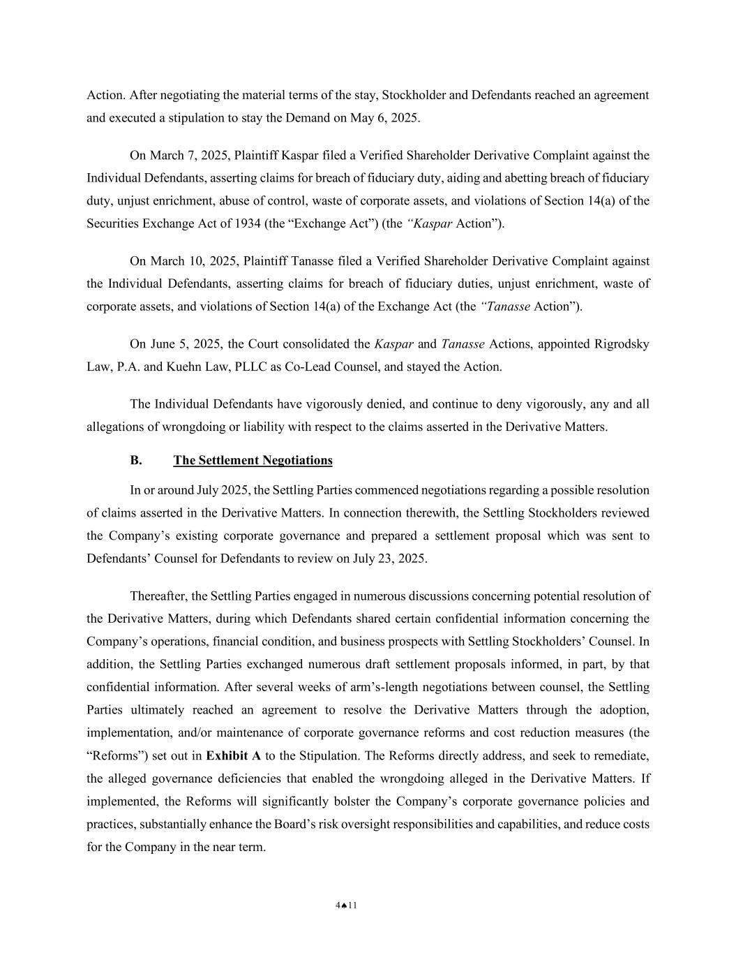 4♠11 Action. After negotiating the material terms of the stay, Stockholder and Defendants reached an agreement and executed a stipulation to stay the Demand on May 6, 2025. On March 7, 2025, Plaintiff Kaspar filed a Verified Shareholder Derivative Complaint against the Individual Defendants, asserting claims for breach of fiduciary duty, aiding and abetting breach of fiduciary duty, unjust enrichment, abuse of control, waste of corporate assets, and violations of Section 14(a) of the Securities Exchange Act of 1934 (the “Exchange Act”) (the “Kaspar Action”). On March 10, 2025, Plaintiff Tanasse filed a Verified Shareholder Derivative Complaint against the Individual Defendants, asserting claims for breach of fiduciary duties, unjust enrichment, waste of corporate assets, and violations of Section 14(a) of the Exchange Act (the “Tanasse Action”). On June 5, 2025, the Court consolidated the Kaspar and Tanasse Actions, appointed Rigrodsky Law, P.A. and Kuehn Law, PLLC as Co-Lead Counsel, and stayed the Action. The Individual Defendants have vigorously denied, and continue to deny vigorously, any and all allegations of wrongdoing or liability with respect to the claims asserted in the Derivative Matters. B. The Settlement Negotiations In or around July 2025, the Settling Parties commenced negotiations regarding a possible resolution of claims asserted in the Derivative Matters. In connection therewith, the Settling Stockholders reviewed the Company’s existing corporate governance and prepared a settlement proposal which was sent to Defendants’ Counsel for Defendants to review on July 23, 2025. Thereafter, the Settling Parties engaged in numerous discussions concerning potential resolution of the Derivative Matters, during which Defendants shared certain confidential information concerning the Company’s operations, financial condition, and business prospects with Settling Stockholders’ Counsel. In addition, the Settling Parties exchanged numerous draft settlement proposals informed, in part, by that confidential information. After several weeks of arm’s-length negotiations between counsel, the Settling Parties ultimately reached an agreement to resolve the Derivative Matters through the adoption, implementation, and/or maintenance of corporate governance reforms and cost reduction measures (the “Reforms”) set out in Exhibit A to the Stipulation. The Reforms directly address, and seek to remediate, the alleged governance deficiencies that enabled the wrongdoing alleged in the Derivative Matters. If implemented, the Reforms will significantly bolster the Company’s corporate governance policies and practices, substantially enhance the Board’s risk oversight responsibilities and capabilities, and reduce costs for the Company in the near term.
