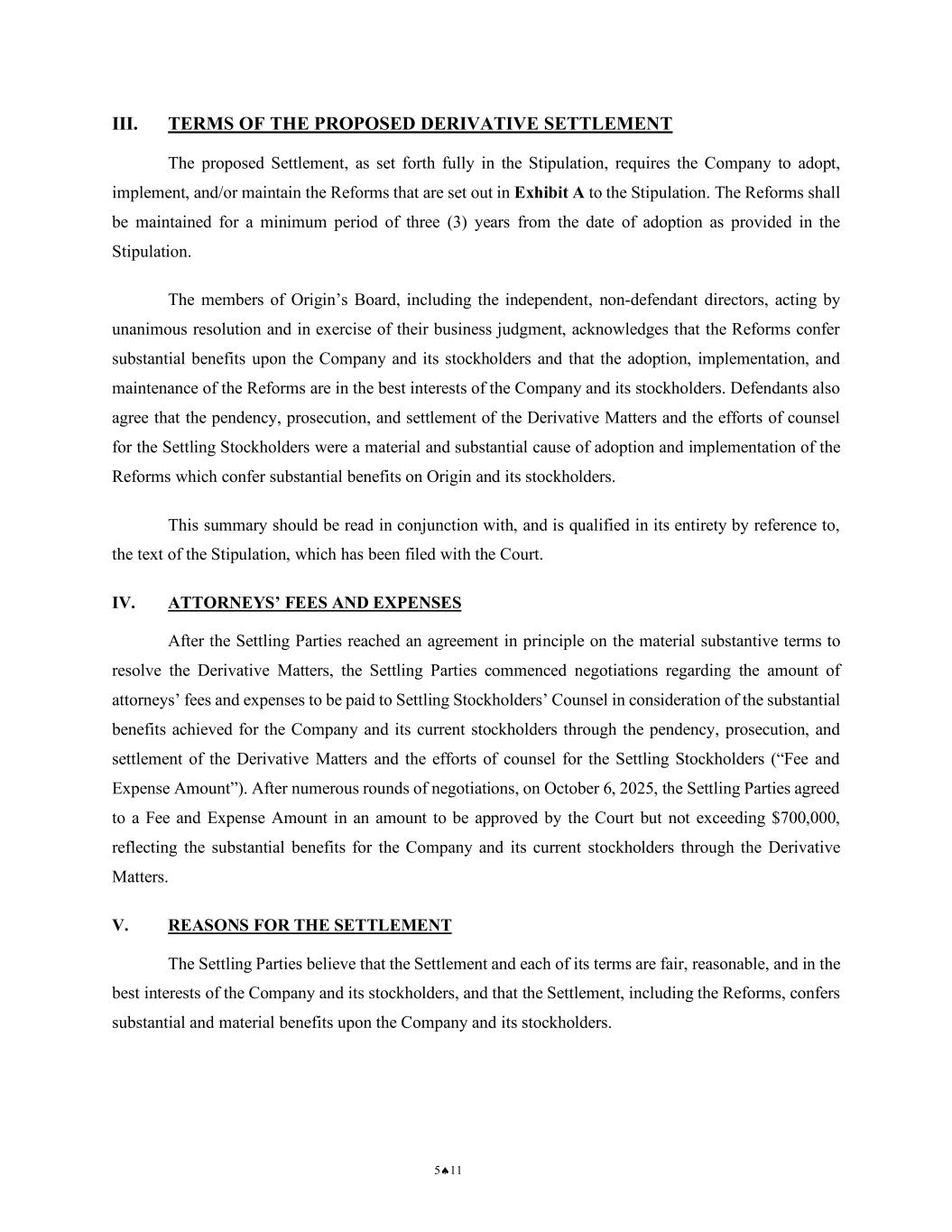 5♠11 III. TERMS OF THE PROPOSED DERIVATIVE SETTLEMENT The proposed Settlement, as set forth fully in the Stipulation, requires the Company to adopt, implement, and/or maintain the Reforms that are set out in Exhibit A to the Stipulation. The Reforms shall be maintained for a minimum period of three (3) years from the date of adoption as provided in the Stipulation. The members of Origin’s Board, including the independent, non-defendant directors, acting by unanimous resolution and in exercise of their business judgment, acknowledges that the Reforms confer substantial benefits upon the Company and its stockholders and that the adoption, implementation, and maintenance of the Reforms are in the best interests of the Company and its stockholders. Defendants also agree that the pendency, prosecution, and settlement of the Derivative Matters and the efforts of counsel for the Settling Stockholders were a material and substantial cause of adoption and implementation of the Reforms which confer substantial benefits on Origin and its stockholders. This summary should be read in conjunction with, and is qualified in its entirety by reference to, the text of the Stipulation, which has been filed with the Court. IV. ATTORNEYS’ FEES AND EXPENSES After the Settling Parties reached an agreement in principle on the material substantive terms to resolve the Derivative Matters, the Settling Parties commenced negotiations regarding the amount of attorneys’ fees and expenses to be paid to Settling Stockholders’ Counsel in consideration of the substantial benefits achieved for the Company and its current stockholders through the pendency, prosecution, and settlement of the Derivative Matters and the efforts of counsel for the Settling Stockholders (“Fee and Expense Amount”). After numerous rounds of negotiations, on October 6, 2025, the Settling Parties agreed to a Fee and Expense Amount in an amount to be approved by the Court but not exceeding $700,000, reflecting the substantial benefits for the Company and its current stockholders through the Derivative Matters. V. REASONS FOR THE SETTLEMENT The Settling Parties believe that the Settlement and each of its terms are fair, reasonable, and in the best interests of the Company and its stockholders, and that the Settlement, including the Reforms, confers substantial and material benefits upon the Company and its stockholders.