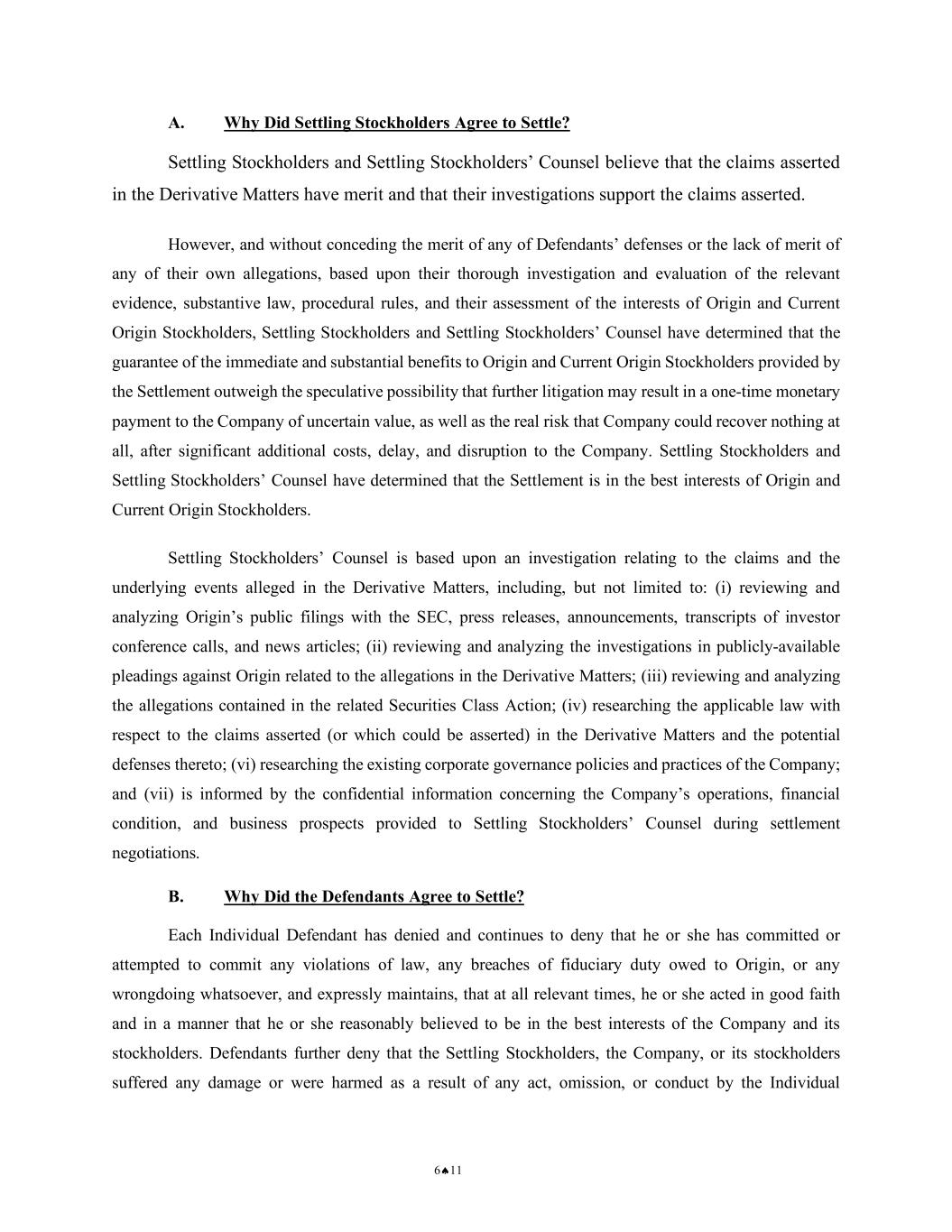 6♠11 A. Why Did Settling Stockholders Agree to Settle? Settling Stockholders and Settling Stockholders’ Counsel believe that the claims asserted in the Derivative Matters have merit and that their investigations support the claims asserted. However, and without conceding the merit of any of Defendants’ defenses or the lack of merit of any of their own allegations, based upon their thorough investigation and evaluation of the relevant evidence, substantive law, procedural rules, and their assessment of the interests of Origin and Current Origin Stockholders, Settling Stockholders and Settling Stockholders’ Counsel have determined that the guarantee of the immediate and substantial benefits to Origin and Current Origin Stockholders provided by the Settlement outweigh the speculative possibility that further litigation may result in a one-time monetary payment to the Company of uncertain value, as well as the real risk that Company could recover nothing at all, after significant additional costs, delay, and disruption to the Company. Settling Stockholders and Settling Stockholders’ Counsel have determined that the Settlement is in the best interests of Origin and Current Origin Stockholders. Settling Stockholders’ Counsel is based upon an investigation relating to the claims and the underlying events alleged in the Derivative Matters, including, but not limited to: (i) reviewing and analyzing Origin’s public filings with the SEC, press releases, announcements, transcripts of investor conference calls, and news articles; (ii) reviewing and analyzing the investigations in publicly-available pleadings against Origin related to the allegations in the Derivative Matters; (iii) reviewing and analyzing the allegations contained in the related Securities Class Action; (iv) researching the applicable law with respect to the claims asserted (or which could be asserted) in the Derivative Matters and the potential defenses thereto; (vi) researching the existing corporate governance policies and practices of the Company; and (vii) is informed by the confidential information concerning the Company’s operations, financial condition, and business prospects provided to Settling Stockholders’ Counsel during settlement negotiations. B. Why Did the Defendants Agree to Settle? Each Individual Defendant has denied and continues to deny that he or she has committed or attempted to commit any violations of law, any breaches of fiduciary duty owed to Origin, or any wrongdoing whatsoever, and expressly maintains, that at all relevant times, he or she acted in good faith and in a manner that he or she reasonably believed to be in the best interests of the Company and its stockholders. Defendants further deny that the Settling Stockholders, the Company, or its stockholders suffered any damage or were harmed as a result of any act, omission, or conduct by the Individual