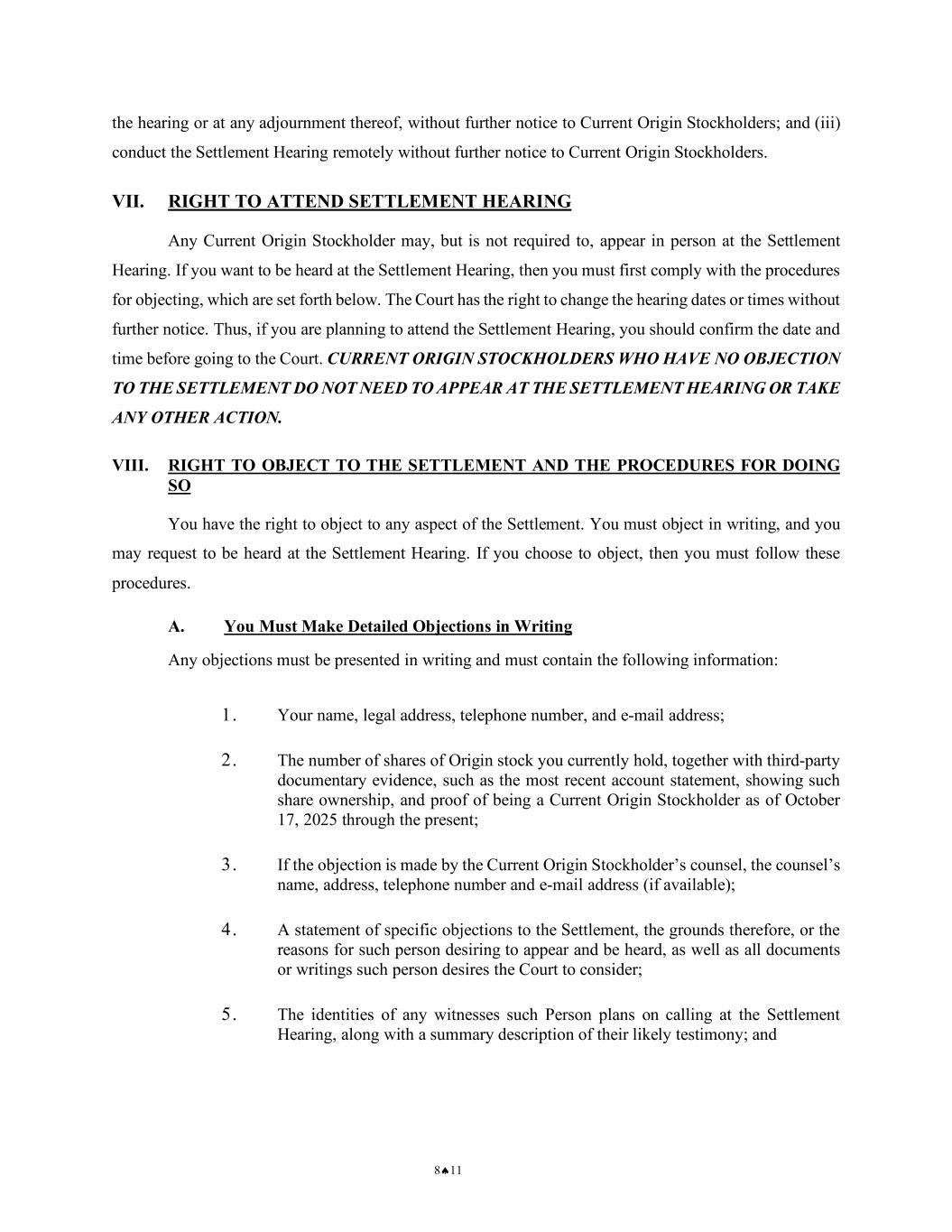 8♠11 the hearing or at any adjournment thereof, without further notice to Current Origin Stockholders; and (iii) conduct the Settlement Hearing remotely without further notice to Current Origin Stockholders. VII. RIGHT TO ATTEND SETTLEMENT HEARING Any Current Origin Stockholder may, but is not required to, appear in person at the Settlement Hearing. If you want to be heard at the Settlement Hearing, then you must first comply with the procedures for objecting, which are set forth below. The Court has the right to change the hearing dates or times without further notice. Thus, if you are planning to attend the Settlement Hearing, you should confirm the date and time before going to the Court. CURRENT ORIGIN STOCKHOLDERS WHO HAVE NO OBJECTION TO THE SETTLEMENT DO NOT NEED TO APPEAR AT THE SETTLEMENT HEARING OR TAKE ANY OTHER ACTION. VIII. RIGHT TO OBJECT TO THE SETTLEMENT AND THE PROCEDURES FOR DOING SO You have the right to object to any aspect of the Settlement. You must object in writing, and you may request to be heard at the Settlement Hearing. If you choose to object, then you must follow these procedures. A. You Must Make Detailed Objections in Writing Any objections must be presented in writing and must contain the following information: 1. Your name, legal address, telephone number, and e-mail address; 2. The number of shares of Origin stock you currently hold, together with third-party documentary evidence, such as the most recent account statement, showing such share ownership, and proof of being a Current Origin Stockholder as of October 17, 2025 through the present; 3. If the objection is made by the Current Origin Stockholder’s counsel, the counsel’s name, address, telephone number and e-mail address (if available); 4. A statement of specific objections to the Settlement, the grounds therefore, or the reasons for such person desiring to appear and be heard, as well as all documents or writings such person desires the Court to consider; 5. The identities of any witnesses such Person plans on calling at the Settlement Hearing, along with a summary description of their likely testimony; and