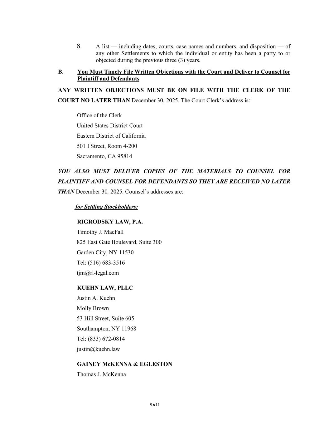 9♠11 6. A list — including dates, courts, case names and numbers, and disposition — of any other Settlements to which the individual or entity has been a party to or objected during the previous three (3) years. B. You Must Timely File Written Objections with the Court and Deliver to Counsel for Plaintiff and Defendants ANY WRITTEN OBJECTIONS MUST BE ON FILE WITH THE CLERK OF THE COURT NO LATER THAN December 30, 2025. The Court Clerk’s address is: Office of the Clerk United States District Court Eastern District of California 501 I Street, Room 4-200 Sacramento, CA 95814 YOU ALSO MUST DELIVER COPIES OF THE MATERIALS TO COUNSEL FOR PLAINTIFF AND COUNSEL FOR DEFENDANTS SO THEY ARE RECEIVED NO LATER THAN December 30, 2025. Counsel’s addresses are: for Settling Stockholders: RIGRODSKY LAW, P.A. Timothy J. MacFall 825 East Gate Boulevard, Suite 300 Garden City, NY 11530 Tel: (516) 683-3516 tjm@rl-legal.com KUEHN LAW, PLLC Justin A. Kuehn Molly Brown 53 Hill Street, Suite 605 Southampton, NY 11968 Tel: (833) 672-0814 justin@kuehn.law GAINEY McKENNA & EGLESTON Thomas J. McKenna