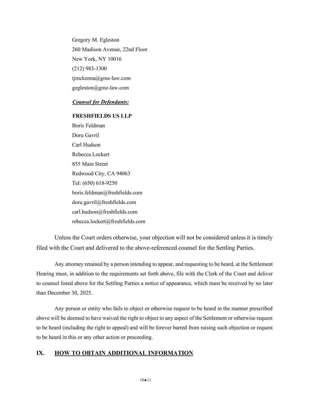 10♠11 Gregory M. Egleston 260 Madison Avenue, 22nd Floor New York, NY 10016 (212) 983-1300 tjmckenna@gme-law.com gegleston@gme-law.com Counsel for Defendants: FRESHFIELDS US LLP Boris Feldman Doru Gavril Carl Hudson Rebecca Lockert 855 Main Street Redwood City, CA 94063 Tel: (650) 618-9250 boris.feldman@freshfields.com doru.gavril@freshfields.com carl.hudson@freshfields.com rebecca.lockert@freshfields.com Unless the Court orders otherwise, your objection will not be considered unless it is timely filed with the Court and delivered to the above-referenced counsel for the Settling Parties. Any attorney retained by a person intending to appear, and requesting to be heard, at the Settlement Hearing must, in addition to the requirements set forth above, file with the Clerk of the Court and deliver to counsel listed above for the Settling Parties a notice of appearance, which must be received by no later than December 30, 2025. Any person or entity who fails to object or otherwise request to be heard in the manner prescribed above will be deemed to have waived the right to object to any aspect of the Settlement or otherwise request to be heard (including the right to appeal) and will be forever barred from raising such objection or request to be heard in this or any other action or proceeding. IX. HOW TO OBTAIN ADDITIONAL INFORMATION