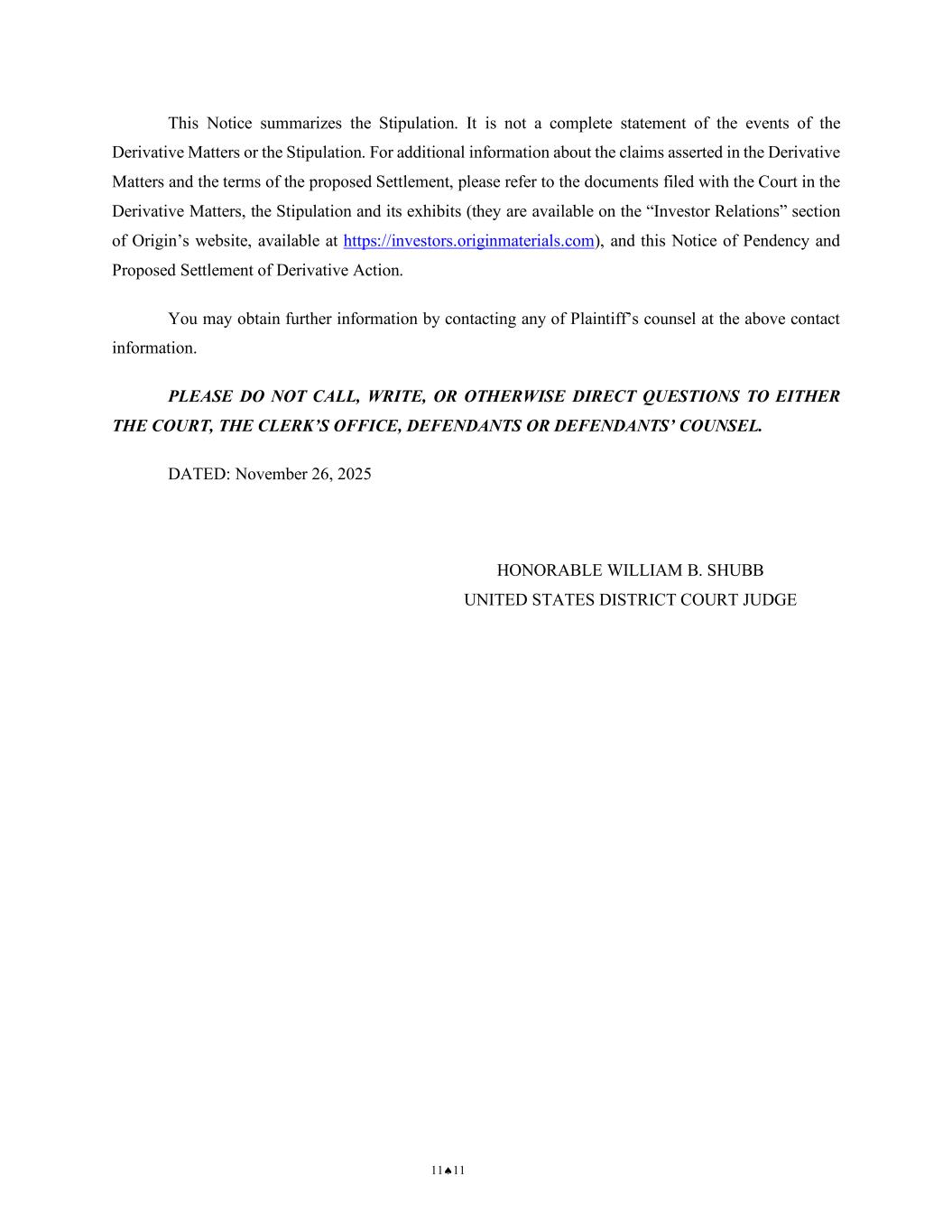 11♠11 This Notice summarizes the Stipulation. It is not a complete statement of the events of the Derivative Matters or the Stipulation. For additional information about the claims asserted in the Derivative Matters and the terms of the proposed Settlement, please refer to the documents filed with the Court in the Derivative Matters, the Stipulation and its exhibits (they are available on the “Investor Relations” section of Origin’s website, available at https://investors.originmaterials.com), and this Notice of Pendency and Proposed Settlement of Derivative Action. You may obtain further information by contacting any of Plaintiff’s counsel at the above contact information. PLEASE DO NOT CALL, WRITE, OR OTHERWISE DIRECT QUESTIONS TO EITHER THE COURT, THE CLERK’S OFFICE, DEFENDANTS OR DEFENDANTS’ COUNSEL. DATED: November 26, 2025 HONORABLE WILLIAM B. SHUBB UNITED STATES DISTRICT COURT JUDGE