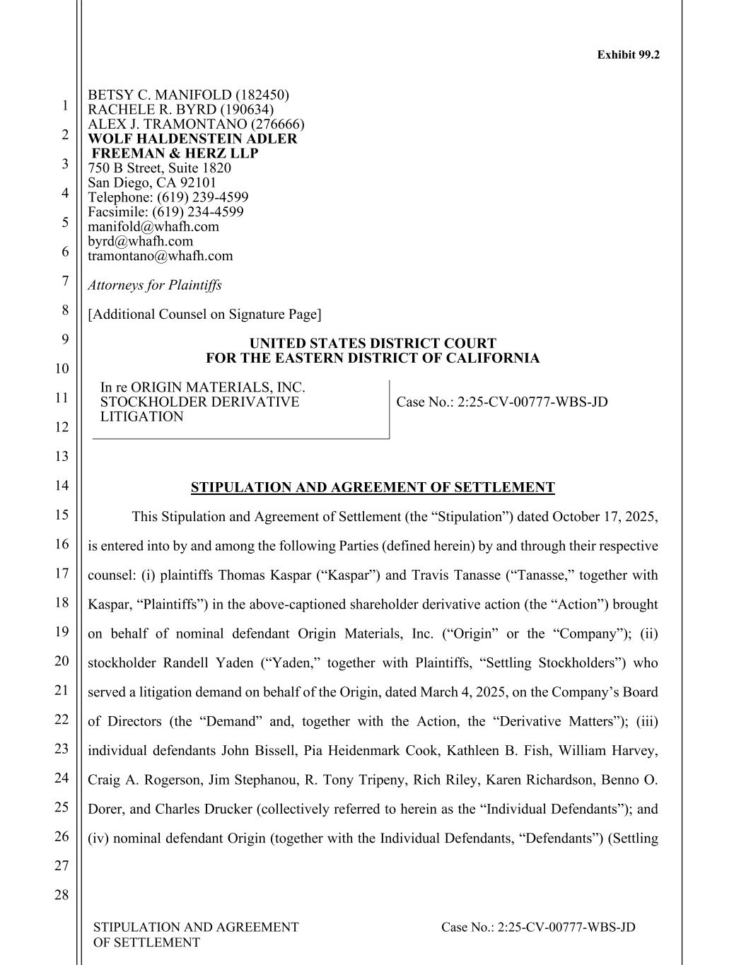 STIPULATION AND AGREEMENT OF SETTLEMENT Case No.: 2:25-CV-00777-WBS-JD 1 2 3 4 5 6 7 8 9 10 11 12 13 14 15 16 17 18 19 20 21 22 23 24 25 26 27 28 BETSY C. MANIFOLD (182450) RACHELE R. BYRD (190634) ALEX J. TRAMONTANO (276666) WOLF HALDENSTEIN ADLER FREEMAN & HERZ LLP 750 B Street, Suite 1820 San Diego, CA 92101 Telephone: (619) 239-4599 Facsimile: (619) 234-4599 manifold@whafh.com byrd@whafh.com tramontano@whafh.com Attorneys for Plaintiffs [Additional Counsel on Signature Page] UNITED STATES DISTRICT COURT FOR THE EASTERN DISTRICT OF CALIFORNIA In re ORIGIN MATERIALS, INC. STOCKHOLDER DERIVATIVE LITIGATION Case No.: 2:25-CV-00777-WBS-JD STIPULATION AND AGREEMENT OF SETTLEMENT This Stipulation and Agreement of Settlement (the “Stipulation”) dated October 17, 2025, is entered into by and among the following Parties (defined herein) by and through their respective counsel: (i) plaintiffs Thomas Kaspar (“Kaspar”) and Travis Tanasse (“Tanasse,” together with Kaspar, “Plaintiffs”) in the above-captioned shareholder derivative action (the “Action”) brought on behalf of nominal defendant Origin Materials, Inc. (“Origin” or the “Company”); (ii) stockholder Randell Yaden (“Yaden,” together with Plaintiffs, “Settling Stockholders”) who served a litigation demand on behalf of the Origin, dated March 4, 2025, on the Company’s Board of Directors (the “Demand” and, together with the Action, the “Derivative Matters”); (iii) individual defendants John Bissell, Pia Heidenmark Cook, Kathleen B. Fish, William Harvey, Craig A. Rogerson, Jim Stephanou, R. Tony Tripeny, Rich Riley, Karen Richardson, Benno O. Dorer, and Charles Drucker (collectively referred to herein as the “Individual Defendants”); and (iv) nominal defendant Origin (together with the Individual Defendants, “Defendants”) (Settling .2