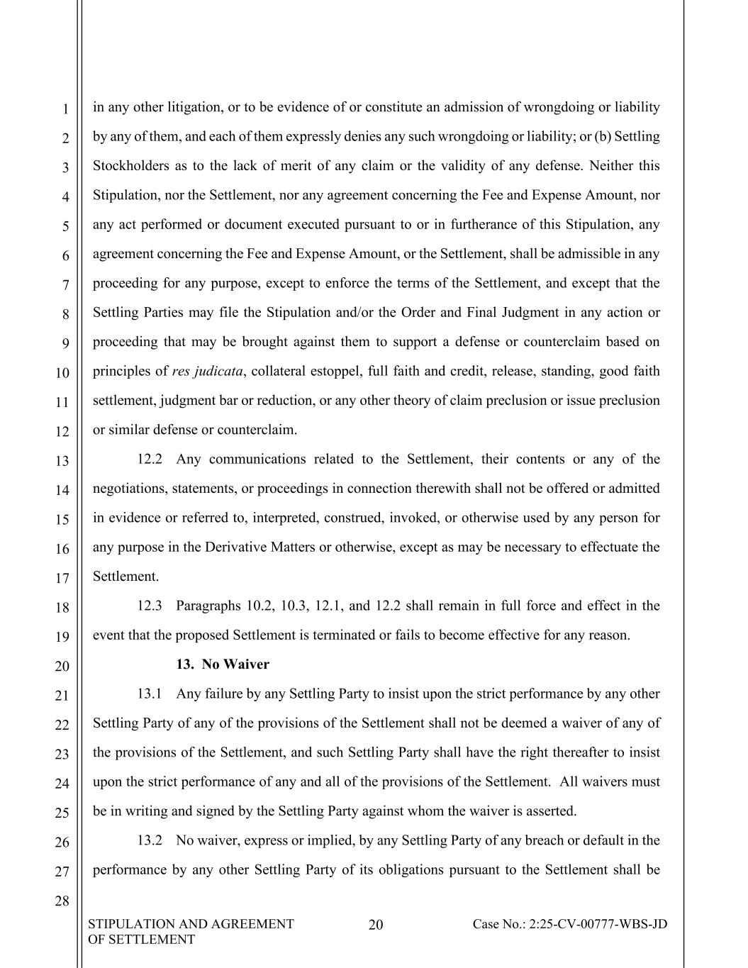 STIPULATION AND AGREEMENT OF SETTLEMENT 20 Case No.: 2:25-CV-00777-WBS-JD 1 2 3 4 5 6 7 8 9 10 11 12 13 14 15 16 17 18 19 20 21 22 23 24 25 26 27 28 in any other litigation, or to be evidence of or constitute an admission of wrongdoing or liability by any of them, and each of them expressly denies any such wrongdoing or liability; or (b) Settling Stockholders as to the lack of merit of any claim or the validity of any defense. Neither this Stipulation, nor the Settlement, nor any agreement concerning the Fee and Expense Amount, nor any act performed or document executed pursuant to or in furtherance of this Stipulation, any agreement concerning the Fee and Expense Amount, or the Settlement, shall be admissible in any proceeding for any purpose, except to enforce the terms of the Settlement, and except that the Settling Parties may file the Stipulation and/or the Order and Final Judgment in any action or proceeding that may be brought against them to support a defense or counterclaim based on principles of res judicata, collateral estoppel, full faith and credit, release, standing, good faith settlement, judgment bar or reduction, or any other theory of claim preclusion or issue preclusion or similar defense or counterclaim. 12.2 Any communications related to the Settlement, their contents or any of the negotiations, statements, or proceedings in connection therewith shall not be offered or admitted in evidence or referred to, interpreted, construed, invoked, or otherwise used by any person for any purpose in the Derivative Matters or otherwise, except as may be necessary to effectuate the Settlement. 12.3 Paragraphs 10.2, 10.3, 12.1, and 12.2 shall remain in full force and effect in the event that the proposed Settlement is terminated or fails to become effective for any reason. 13. No Waiver 13.1 Any failure by any Settling Party to insist upon the strict performance by any other Settling Party of any of the provisions of the Settlement shall not be deemed a waiver of any of the provisions of the Settlement, and such Settling Party shall have the right thereafter to insist upon the strict performance of any and all of the provisions of the Settlement. All waivers must be in writing and signed by the Settling Party against whom the waiver is asserted. 13.2 No waiver, express or implied, by any Settling Party of any breach or default in the performance by any other Settling Party of its obligations pursuant to the Settlement shall be