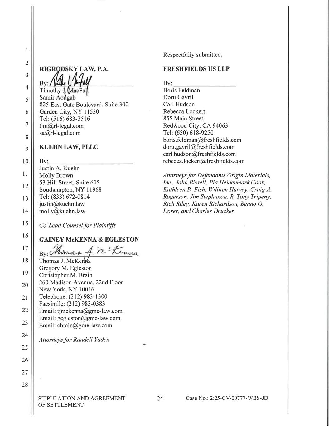 STIPULATION AND AGREEMENT OF SETTLEMENT 24 Case No.: 2:25-CV-00777-WBS-JD 1 2 3 4 5 6 7 8 9 10 11 12 13 14 15 16 17 18 19 20 21 22 23 24 25 26 27 28 RIGRODSKY LAW, P.A. By: Timothy J. MacFall Samir Aougab 825 East Gate Boulevard, Suite 300 Garden City, NY 11530 Tel: (516) 683-3516 tjm@rl-legal.com sa@rl-legal.com KUEHN LAW, PLLC By: Justin A. Kuehn Molly Brown 53 Hill Street, Suite 605 Southampton, NY 11968 Tel: (833) 672-0814 justin@kuehn.law molly@kuehn.law Co-Lead Counsel for Plaintiffs GAINEY McKENNA & EGLESTON By: Thomas J. McKenna Gregory M. Egleston Christopher M. Brain 260 Madison Avenue, 22nd Floor New York, NY 10016 Telephone: (212) 983-1300 Facsimile: (212) 983-0383 Email: tjmckenna@gme-law.com Email: gegleston@gme-law.com Email: cbrain@gme-law.com Attorneys for Randell Yaden Respectfully submitted, FRESHFIELDS US LLP By: ____________________ Boris Feldman Doru Gavril Carl Hudson Rebecca Lockert 855 Main Street Redwood City, CA 94063 Tel: (650) 618-9250 boris.feldman@freshfields.com doru.gavril@freshfields.com carl.hudson@freshfields.com rebecca.lockert@freshfields.com Attorneys for Defendants Origin Materials, Inc., John Bissell, Pia Heidenmark Cook, Kathleen B. Fish, William Harvey, Craig A. Rogerson, Jim Stephanou, R. Tony Tripeny, Rich Riley, Karen Richardson, Benno O. Dorer, and Charles Drucker