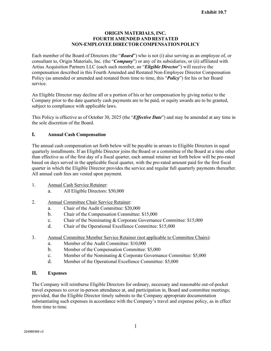 1 324989369 v3 ORIGIN MATERIALS, INC. FOURTH AMENDED AND RESTATED NON-EMPLOYEE DIRECTOR COMPENSATION POLICY Each member of the Board of Directors (the “Board”) who is not (i) also serving as an employee of, or consultant to, Origin Materials, Inc. (the “Company”) or any of its subsidiaries, or (ii) affiliated with Artius Acquisition Partners LLC (each such member, an “Eligible Director”) will receive the compensation described in this Fourth Amended and Restated Non-Employee Director Compensation Policy (as amended or amended and restated from time to time, this “Policy”) for his or her Board service. An Eligible Director may decline all or a portion of his or her compensation by giving notice to the Company prior to the date quarterly cash payments are to be paid, or equity awards are to be granted, subject to compliance with applicable laws. This Policy is effective as of October 30, 2025 (the “Effective Date”) and may be amended at any time in the sole discretion of the Board. I. Annual Cash Compensation The annual cash compensation set forth below will be payable in arrears to Eligible Directors in equal quarterly installments. If an Eligible Director joins the Board or a committee of the Board at a time other than effective as of the first day of a fiscal quarter, each annual retainer set forth below will be pro-rated based on days served in the applicable fiscal quarter, with the pro-rated amount paid for the first fiscal quarter in which the Eligible Director provides the service and regular full quarterly payments thereafter. All annual cash fees are vested upon payment. 1. Annual Cash Service Retainer: a. All Eligible Directors: $50,000 2. Annual Committee Chair Service Retainer: a. Chair of the Audit Committee: $20,000 b. Chair of the Compensation Committee: $15,000 c. Chair of the Nominating & Corporate Governance Committee: $15,000 d. Chair of the Operational Excellence Committee: $15,000 3. Annual Committee Member Service Retainer (not applicable to Committee Chairs): a. Member of the Audit Committee: $10,000 b. Member of the Compensation Committee: $5,000 c. Member of the Nominating & Corporate Governance Committee: $5,000 d. Member of the Operational Excellence Committee: $5,000 II. Expenses The Company will reimburse Eligible Directors for ordinary, necessary and reasonable out-of-pocket travel expenses to cover in-person attendance at, and participation in, Board and committee meetings; provided, that the Eligible Director timely submits to the Company appropriate documentation substantiating such expenses in accordance with the Company’s travel and expense policy, as in effect from time to time. Exhibit 10.7