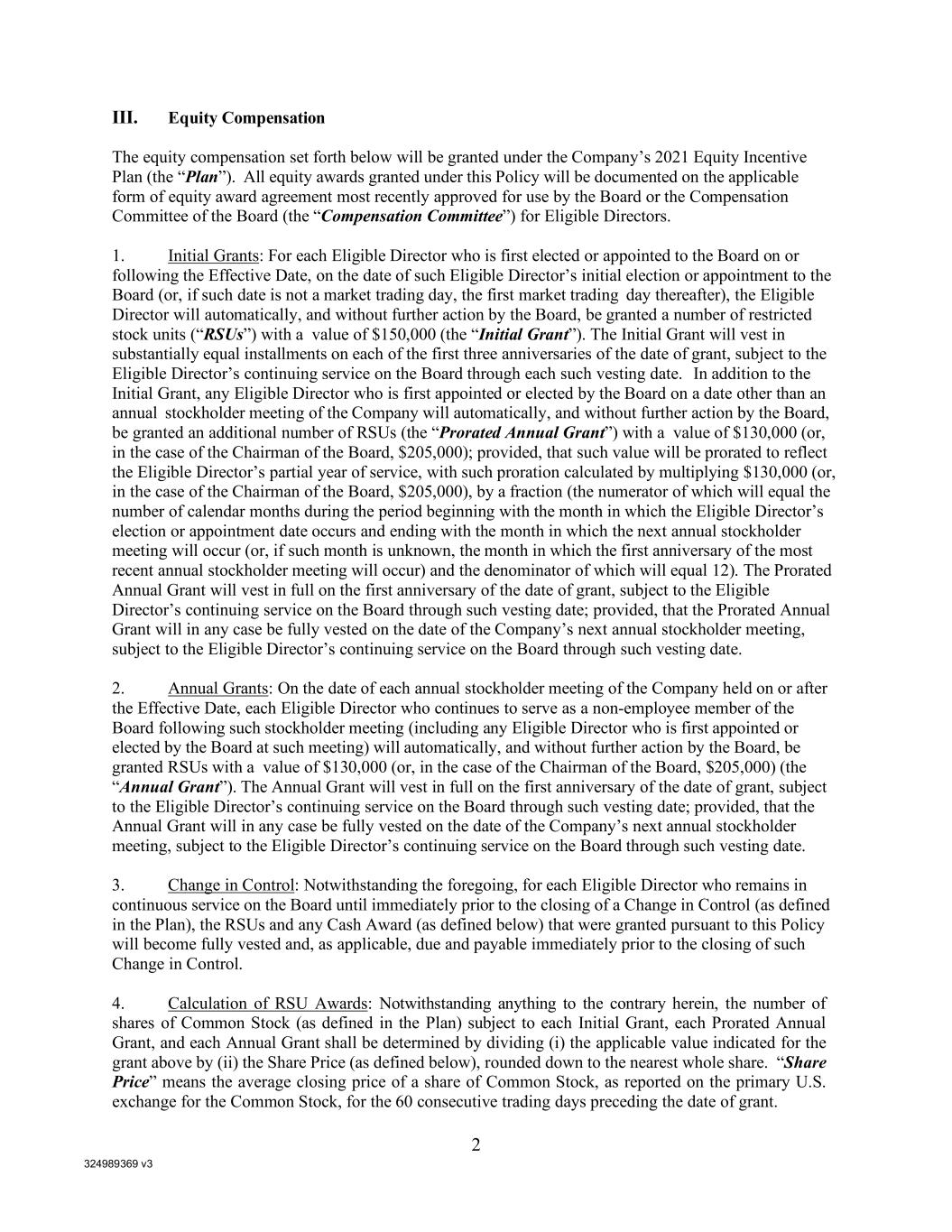 2 324989369 v3 III. Equity Compensation The equity compensation set forth below will be granted under the Company’s 2021 Equity Incentive Plan (the “Plan”). All equity awards granted under this Policy will be documented on the applicable form of equity award agreement most recently approved for use by the Board or the Compensation Committee of the Board (the “Compensation Committee”) for Eligible Directors. 1. Initial Grants: For each Eligible Director who is first elected or appointed to the Board on or following the Effective Date, on the date of such Eligible Director’s initial election or appointment to the Board (or, if such date is not a market trading day, the first market trading day thereafter), the Eligible Director will automatically, and without further action by the Board, be granted a number of restricted stock units (“RSUs”) with a value of $150,000 (the “Initial Grant”). The Initial Grant will vest in substantially equal installments on each of the first three anniversaries of the date of grant, subject to the Eligible Director’s continuing service on the Board through each such vesting date. In addition to the Initial Grant, any Eligible Director who is first appointed or elected by the Board on a date other than an annual stockholder meeting of the Company will automatically, and without further action by the Board, be granted an additional number of RSUs (the “Prorated Annual Grant”) with a value of $130,000 (or, in the case of the Chairman of the Board, $205,000); provided, that such value will be prorated to reflect the Eligible Director’s partial year of service, with such proration calculated by multiplying $130,000 (or, in the case of the Chairman of the Board, $205,000), by a fraction (the numerator of which will equal the number of calendar months during the period beginning with the month in which the Eligible Director’s election or appointment date occurs and ending with the month in which the next annual stockholder meeting will occur (or, if such month is unknown, the month in which the first anniversary of the most recent annual stockholder meeting will occur) and the denominator of which will equal 12). The Prorated Annual Grant will vest in full on the first anniversary of the date of grant, subject to the Eligible Director’s continuing service on the Board through such vesting date; provided, that the Prorated Annual Grant will in any case be fully vested on the date of the Company’s next annual stockholder meeting, subject to the Eligible Director’s continuing service on the Board through such vesting date. 2. Annual Grants: On the date of each annual stockholder meeting of the Company held on or after the Effective Date, each Eligible Director who continues to serve as a non-employee member of the Board following such stockholder meeting (including any Eligible Director who is first appointed or elected by the Board at such meeting) will automatically, and without further action by the Board, be granted RSUs with a value of $130,000 (or, in the case of the Chairman of the Board, $205,000) (the “Annual Grant”). The Annual Grant will vest in full on the first anniversary of the date of grant, subject to the Eligible Director’s continuing service on the Board through such vesting date; provided, that the Annual Grant will in any case be fully vested on the date of the Company’s next annual stockholder meeting, subject to the Eligible Director’s continuing service on the Board through such vesting date. 3. Change in Control: Notwithstanding the foregoing, for each Eligible Director who remains in continuous service on the Board until immediately prior to the closing of a Change in Control (as defined in the Plan), the RSUs and any Cash Award (as defined below) that were granted pursuant to this Policy will become fully vested and, as applicable, due and payable immediately prior to the closing of such Change in Control. 4. Calculation of RSU Awards: Notwithstanding anything to the contrary herein, the number of shares of Common Stock (as defined in the Plan) subject to each Initial Grant, each Prorated Annual Grant, and each Annual Grant shall be determined by dividing (i) the applicable value indicated for the grant above by (ii) the Share Price (as defined below), rounded down to the nearest whole share. “Share Price” means the average closing price of a share of Common Stock, as reported on the primary U.S. exchange for the Common Stock, for the 60 consecutive trading days preceding the date of grant.
